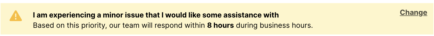 - Basado en la Categoría y Subcategoría que has seleccionado, la prioridad del problema será seleccionada automáticamente. El mensaje en pantalla te informará del tiempo esperado de cuándo se atenderá el problema.
