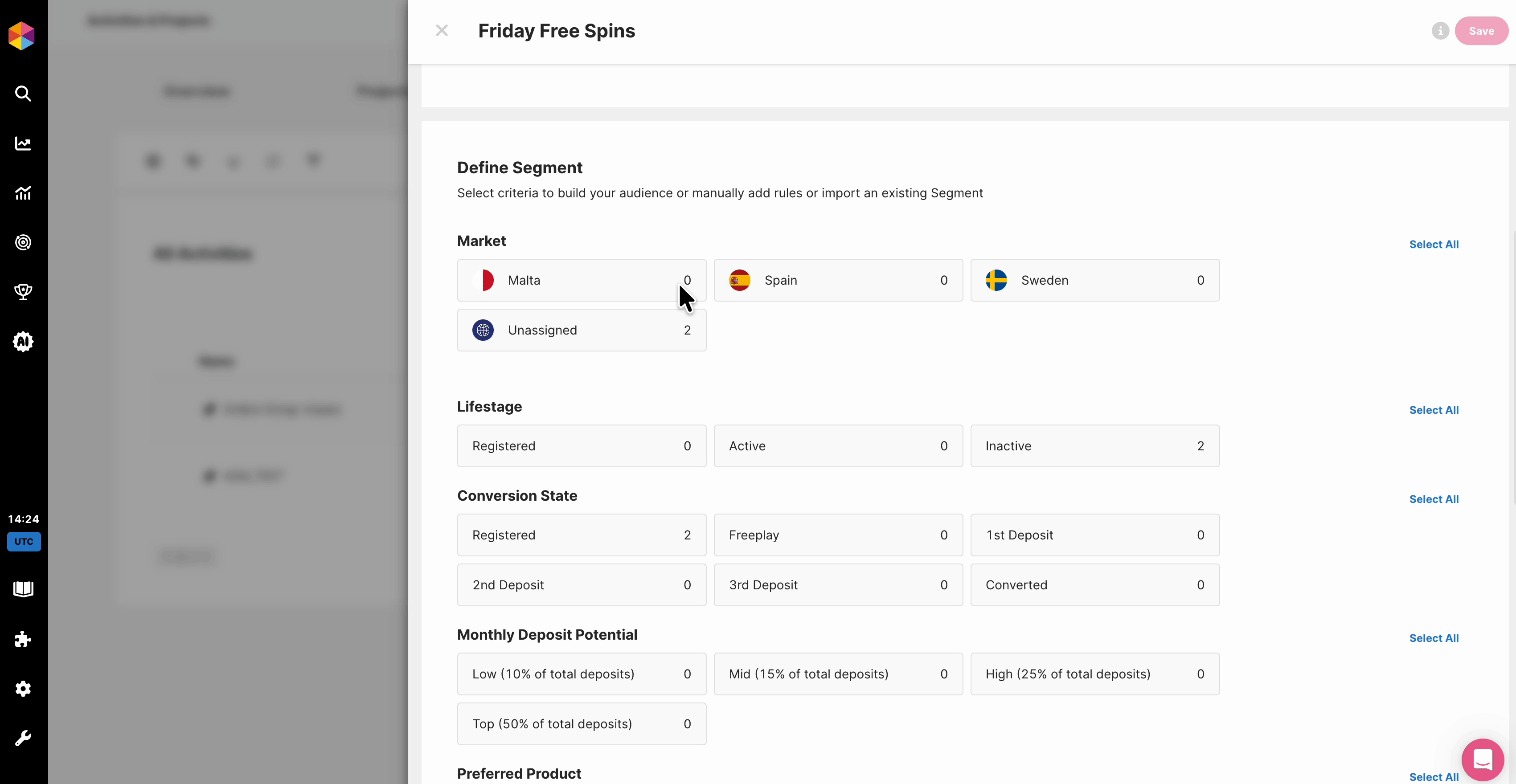- Vertically, selecting multiple criteria will work as an AND correlation. For example, if I select: Market = Malta, Lifestage = Active and Previously Played Product = Casino, my segment will include players with: