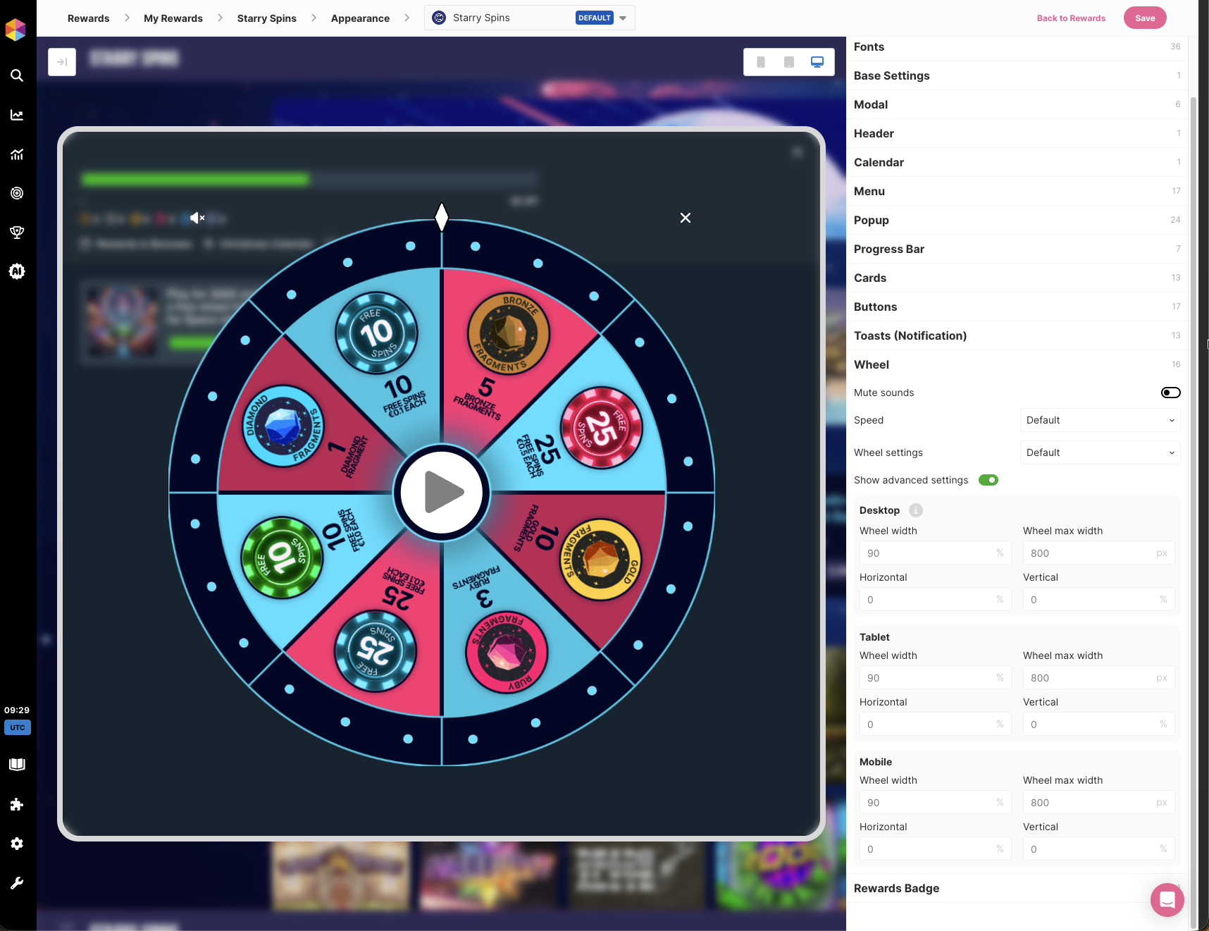 - Appearance – Edit colours, fonts, base settings, and the styling of individual components, such as the Modal, Popup, Progress Bar, Cards, Buttons, Menu, and Notifications. You can also control the speed of the wheel and other visual elements.
