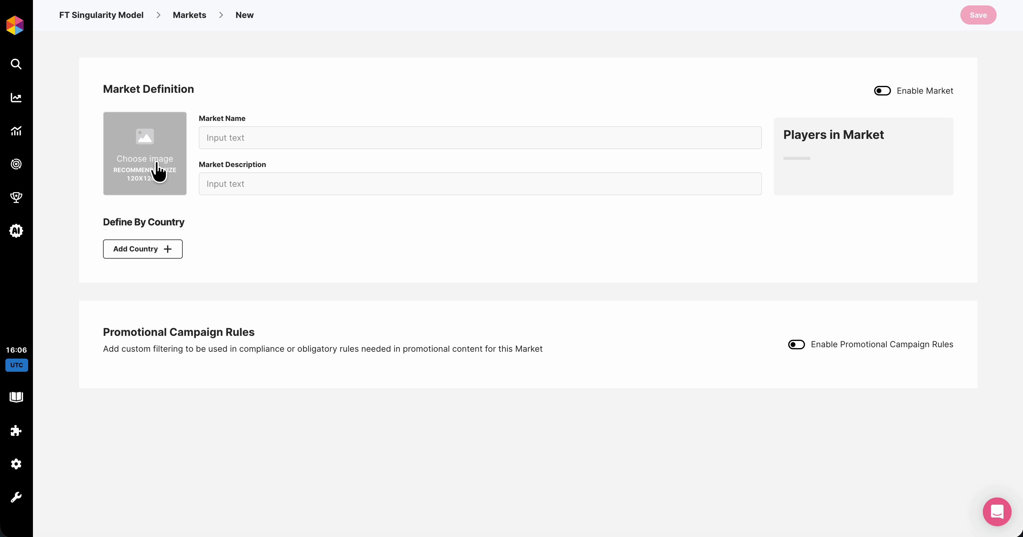 First make sure that you have the correct permissions assigned to your user, then you can find Markets under FT Singularity Model -> Markets, to get started click on New Market.
