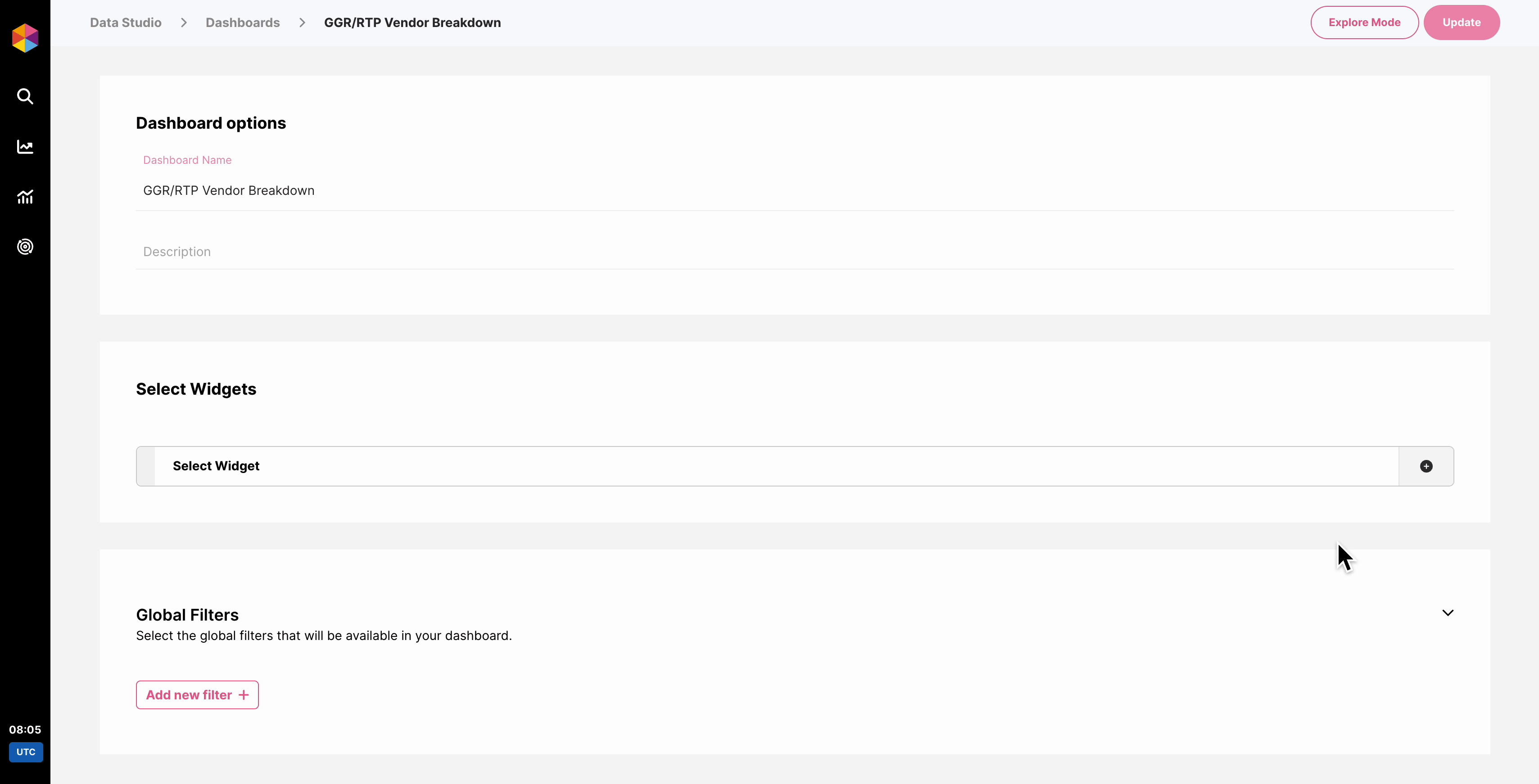 Una vez que nuestro Panel esté creado, podemos añadir un nuevo Widget desde cero y seleccionar el Rendimiento de Actividad en Profundidad Alcance de Datos:
