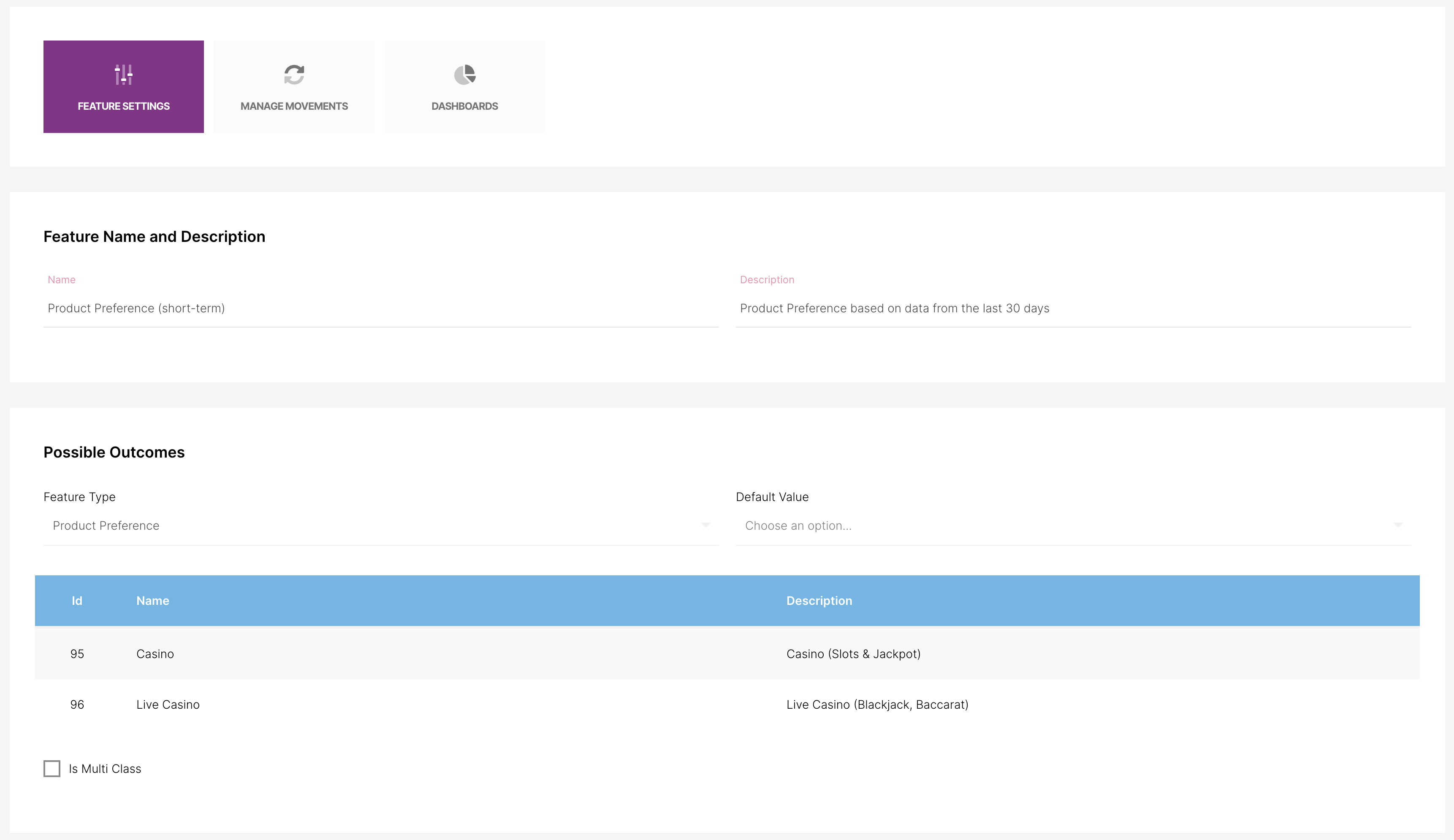 Ahora que tenemos toda la información que necesitamos, podemos configurar esto como un Tipo de Característica dentro del Singularity Model. Comenzando con la Preferencia de Producto podemos crear un nuevo Tipo de Característica.