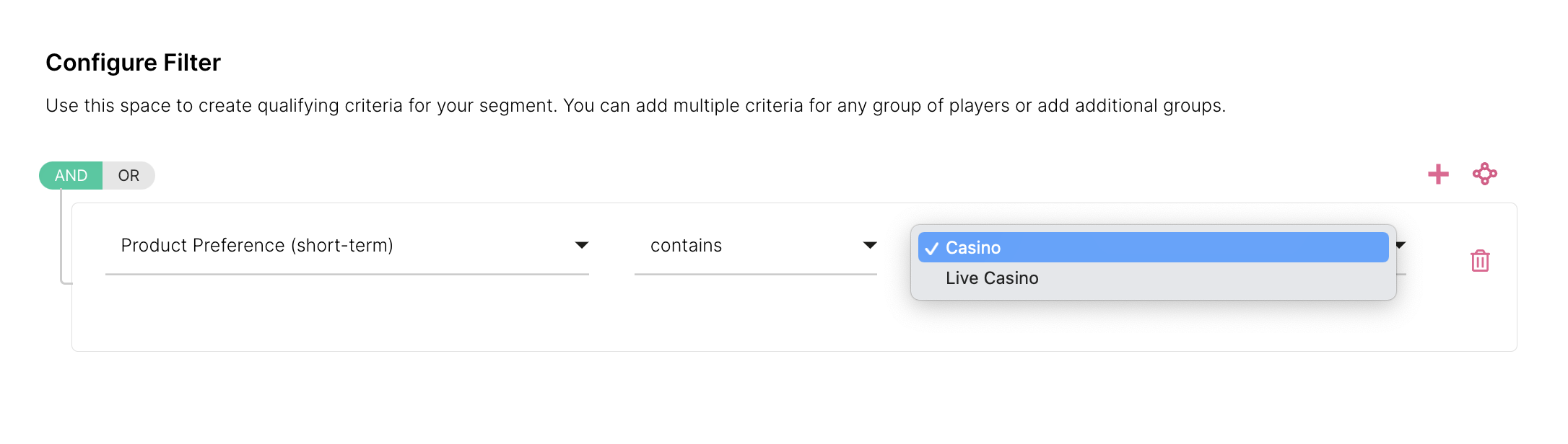 A continuación, podrás encontrar el Preferencia de Producto y Preferencia de Tipo de Juego en la lista estándar de segmentación para ser usado en actividades y lifecycles.