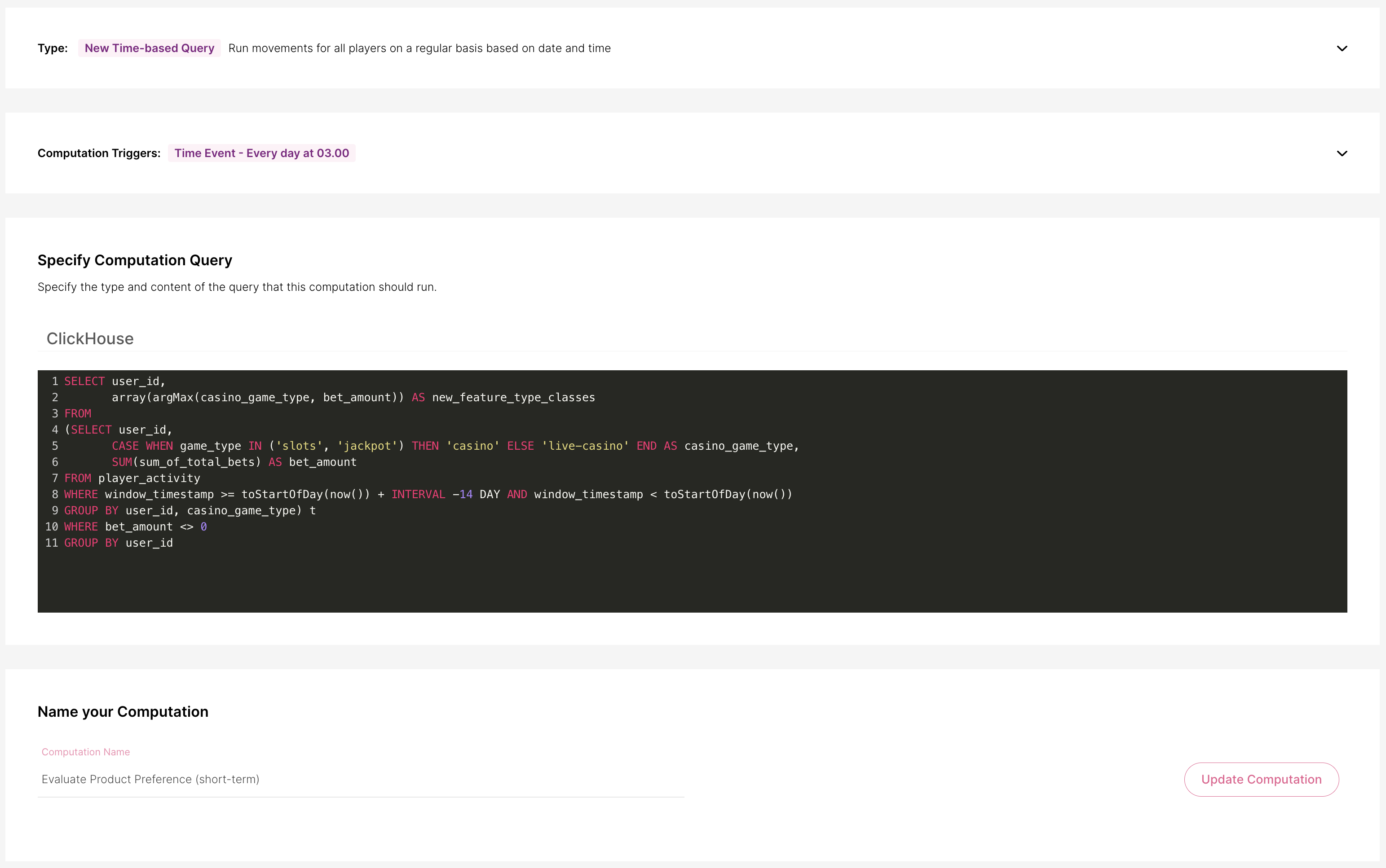 Para este objetivo, queremos que el cálculo se ejecute en una consulta basada en tiempo y preferiblemente durante el tráfico bajo, por lo tanto lo hemos configurado para dispararse a las 03:00 UTC.