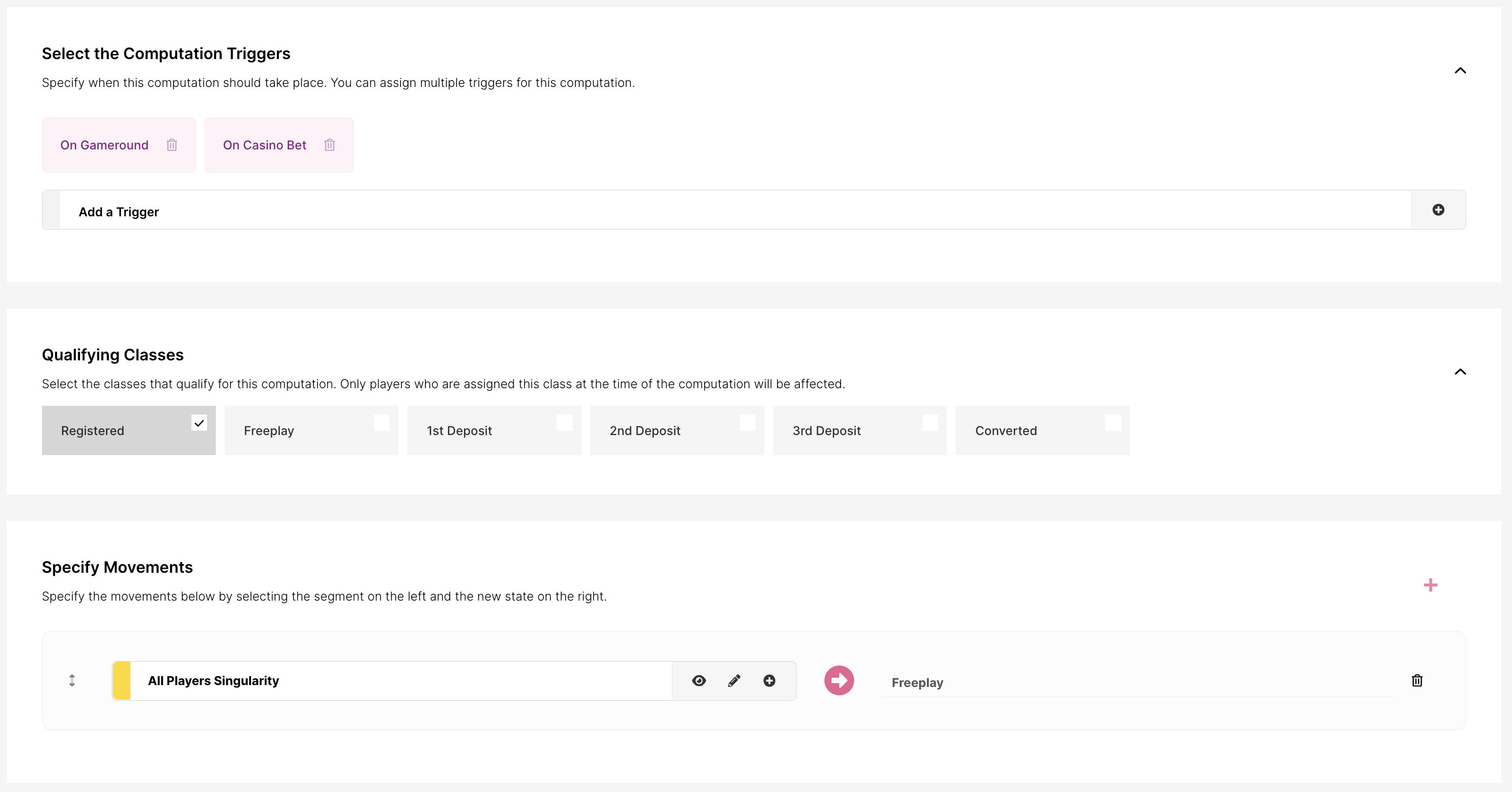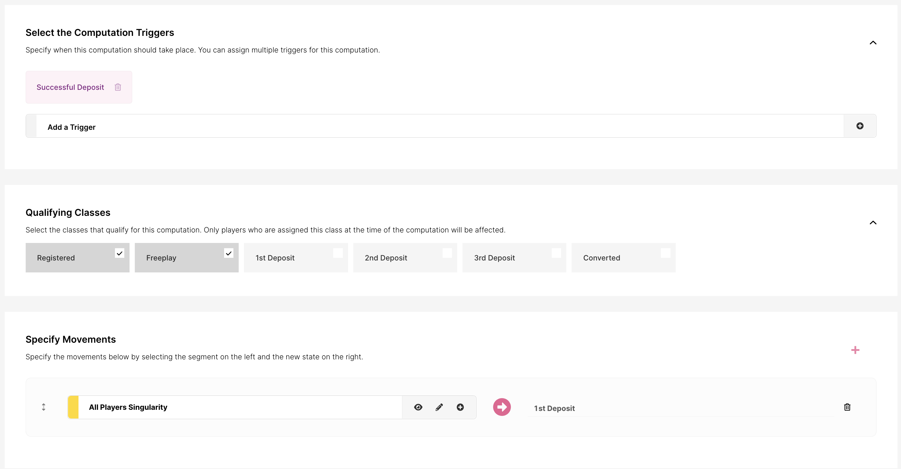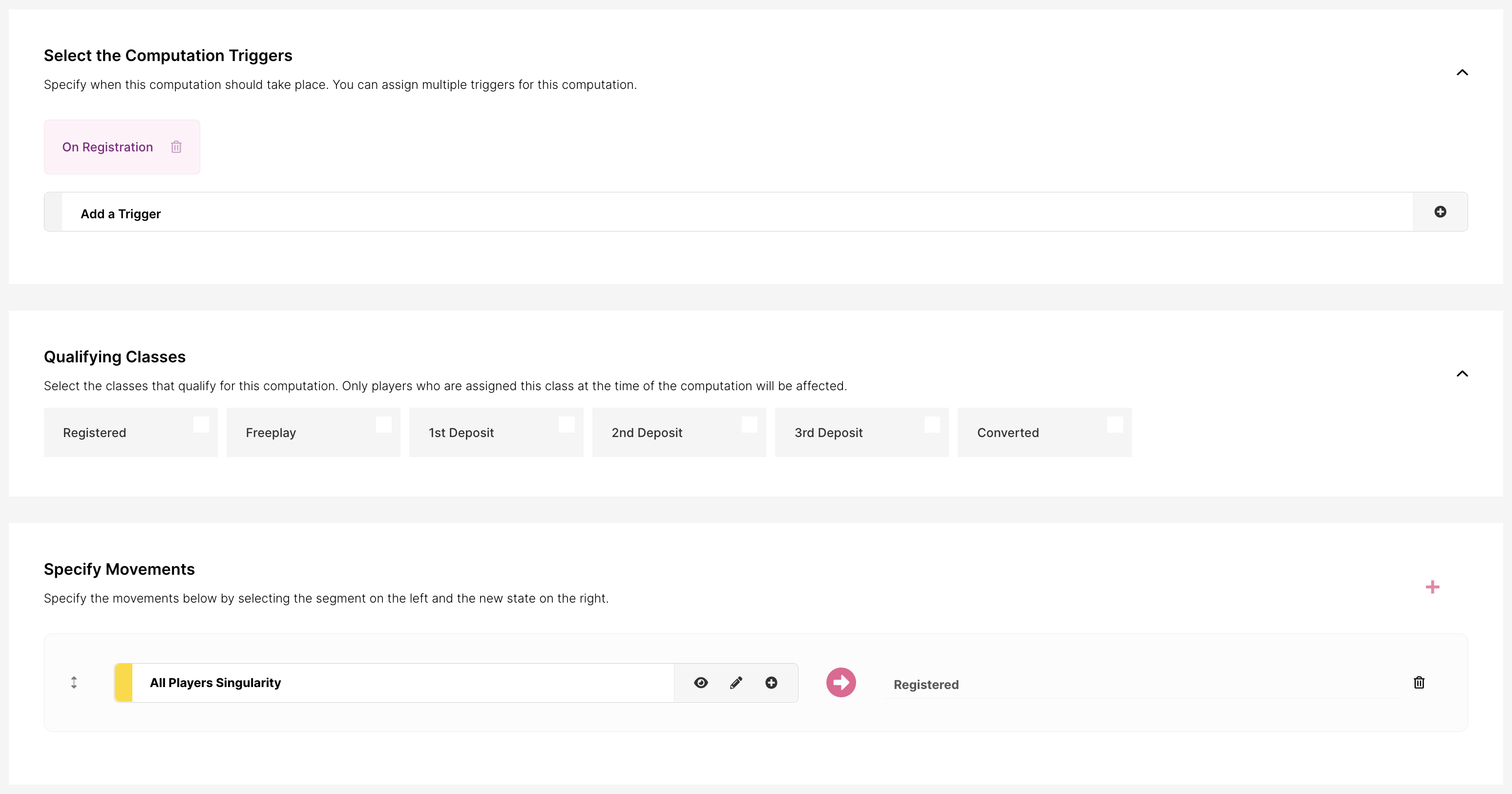 Pueden ser movimientos en tiempo real, que ocurren cuando se produce una acción en tiempo real (como un pago o un registro), o una consulta basada en tiempo. Las consultas basadas en tiempo ocurren a una hora establecida del día y evalúan la base de jugadores para determinar si un jugador debe cambiar de clase.