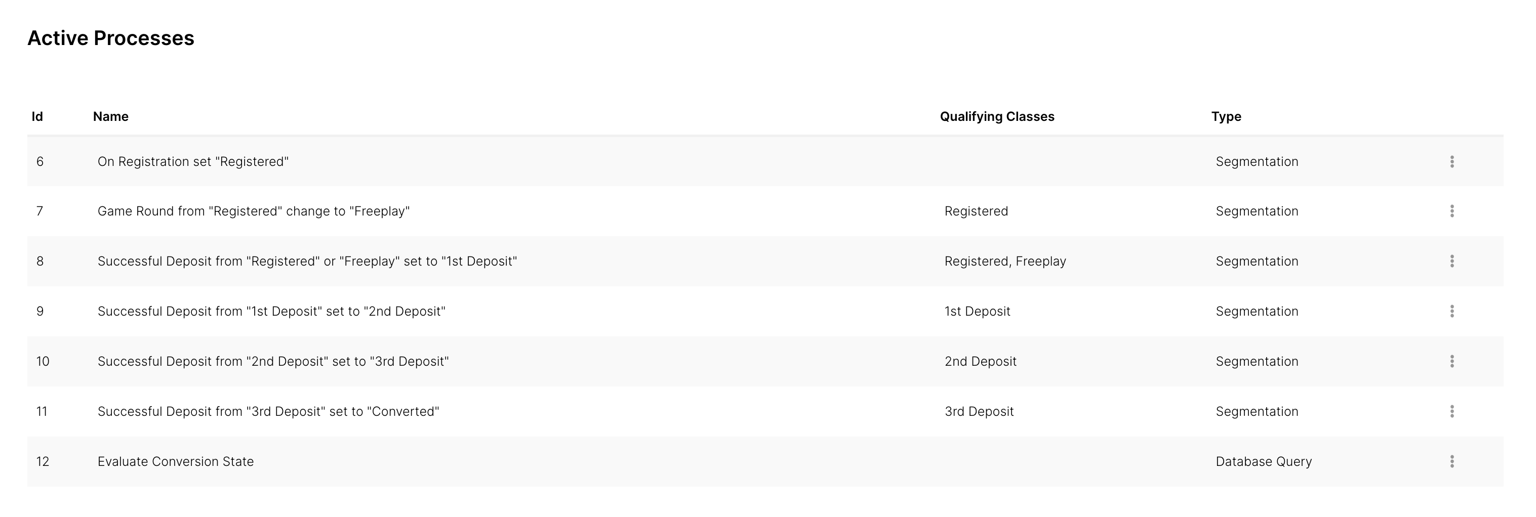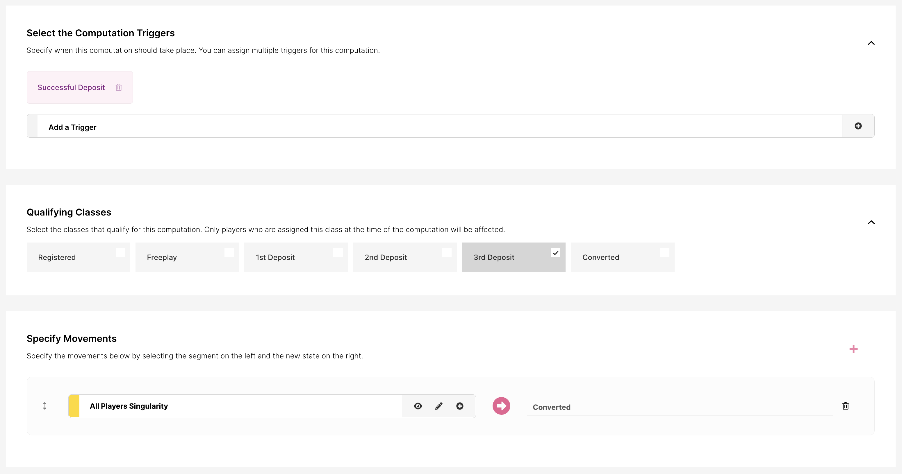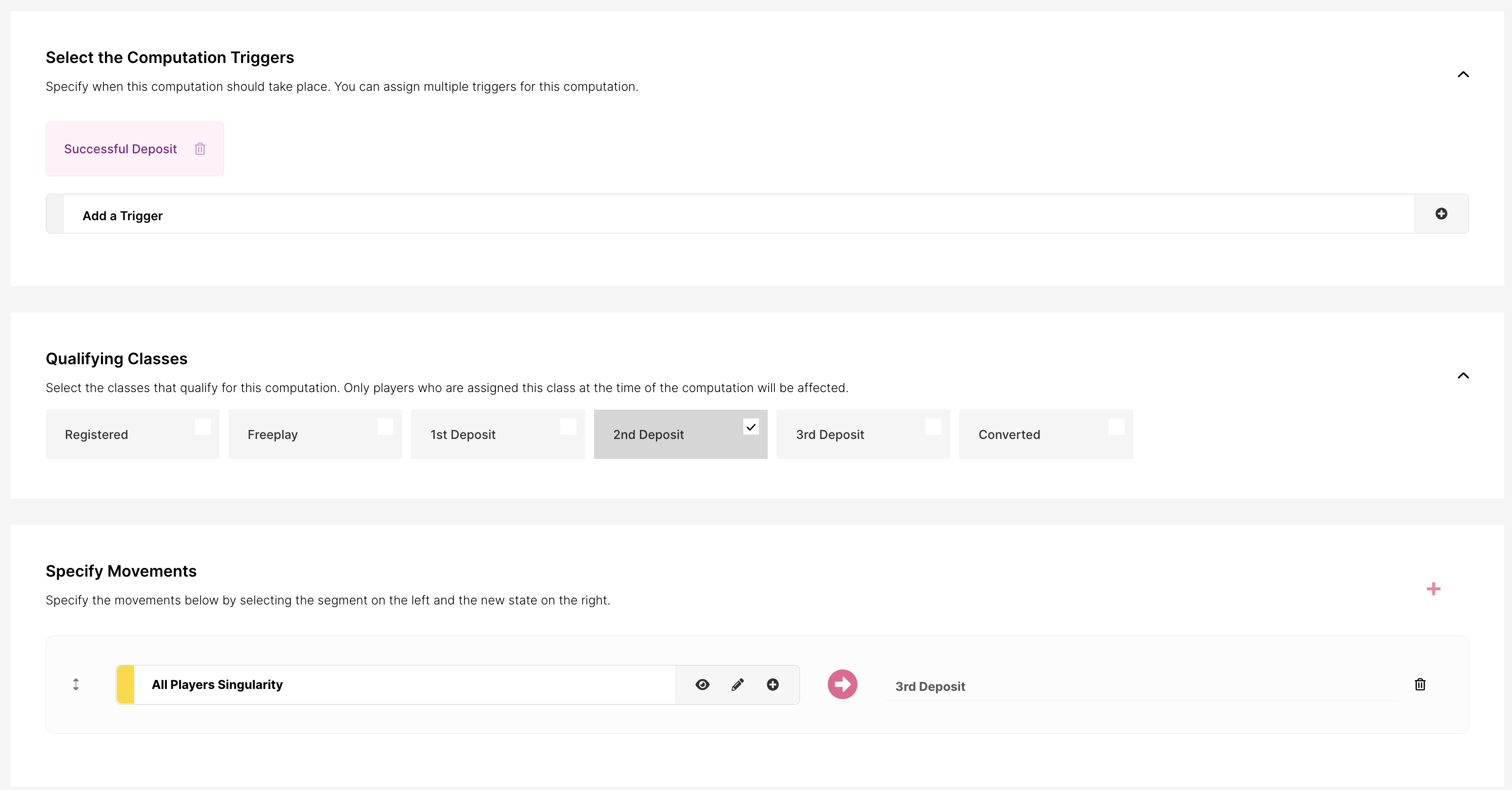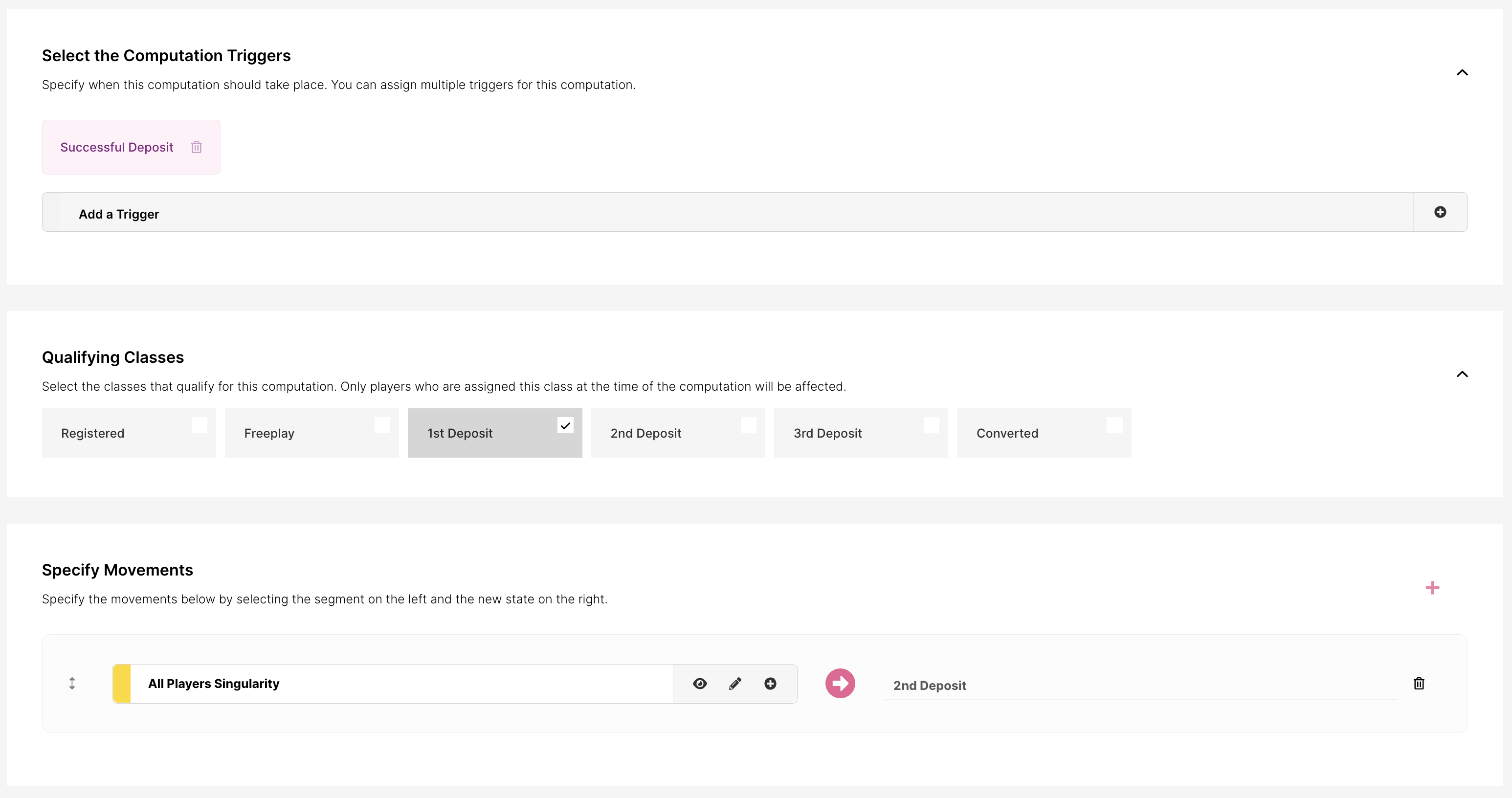 Pueden ser movimientos en tiempo real, que ocurren cuando se produce una acción en tiempo real (como un pago o un registro), o una consulta basada en tiempo. Las consultas basadas en tiempo ocurren a una hora establecida del día y evalúan la base de jugadores para determinar si un jugador debe cambiar de clase.