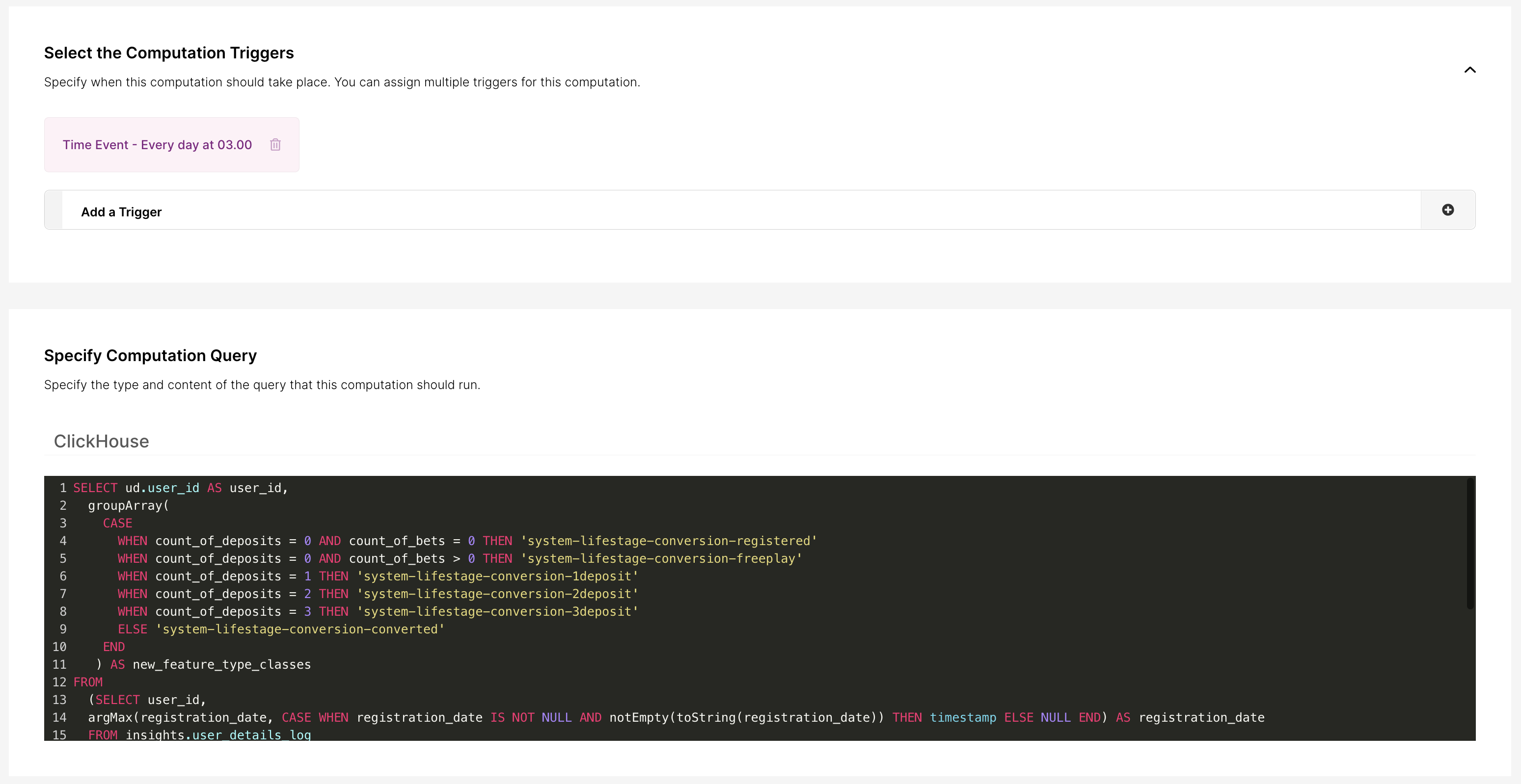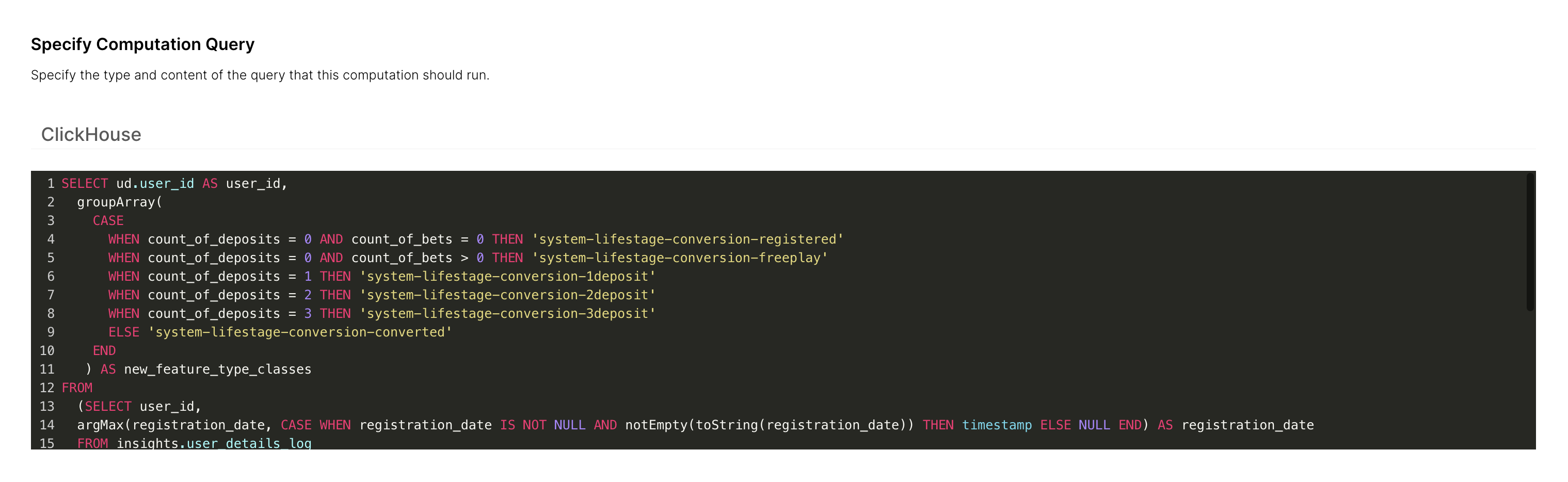 - El propósito de este cálculo es revisar a todos los jugadores y evaluar en qué deberían estar clasificados. La consulta está analizando el recuento de depósitos y recuento de apuestas.
