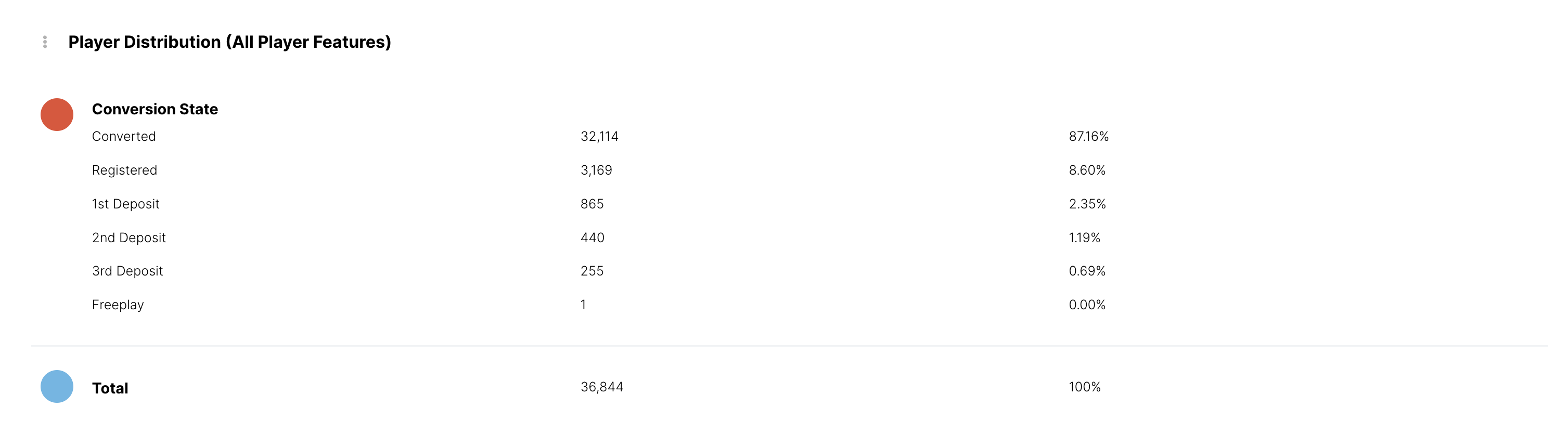 El objetivo de la Funcionalidad del Jugador Estado de Conversión es poder segmentar a los jugadores según dónde se encuentran en el recorrido de conversión. Esto cubre todos los pasos en el embudo de conversión. Un Jugador se considera totalmente convertido cuando ha realizado su cuarto depósito.