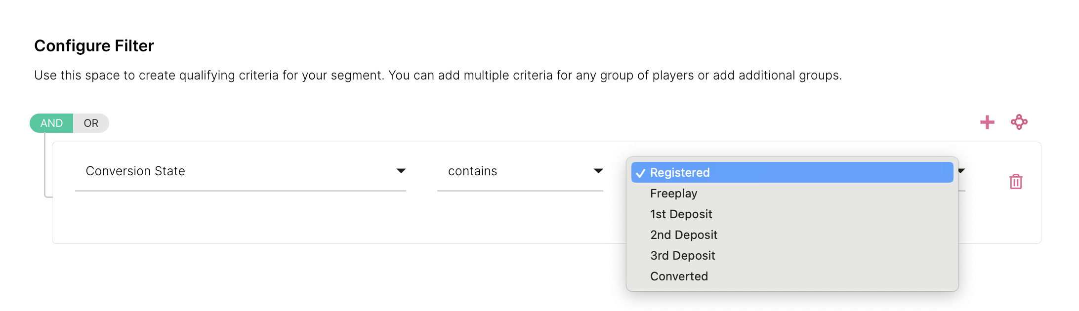 A continuación, puedes usar Estado de Conversión al crear segmentos para Actividades y LifeCycles. Podrás encontrar Estado de Conversión entre los campos del segmento cuando estés creando un segmento.