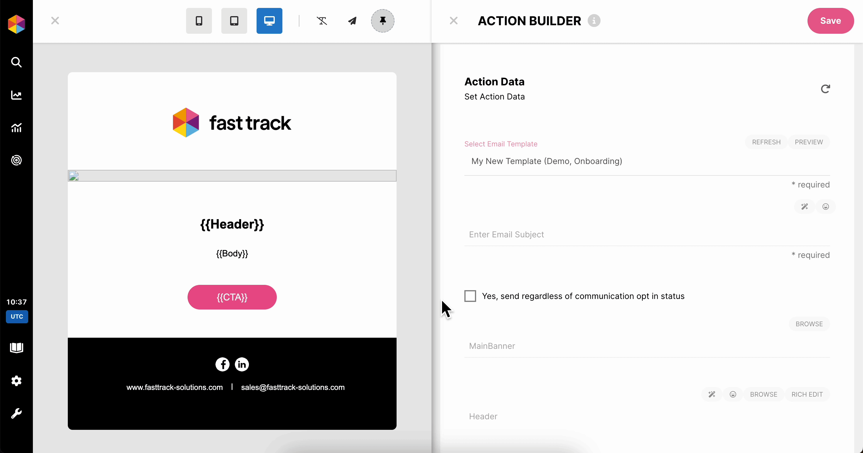 Su Plantilla de Email debe crearse con antelación antes de que pueda seleccionarse y usarse adecuadamente para su acción de correo electrónico. Configure sus plantillas de correo electrónico fácilmente dentro de FT CRM. Lea más sobre plantillas de correo electrónico aquí.