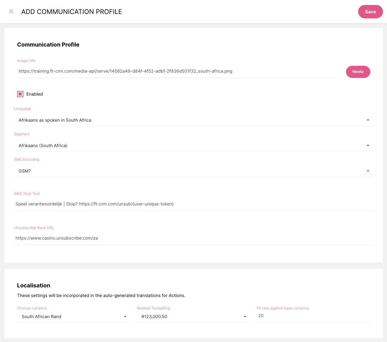 Entonces configuraríamos 2 Perfiles de Comunicación con diferentes idiomas establecidos para el Segmento así como dentro de la configuración del Perfil de Comunicación; uno con afrikáans y el otro con inglés.