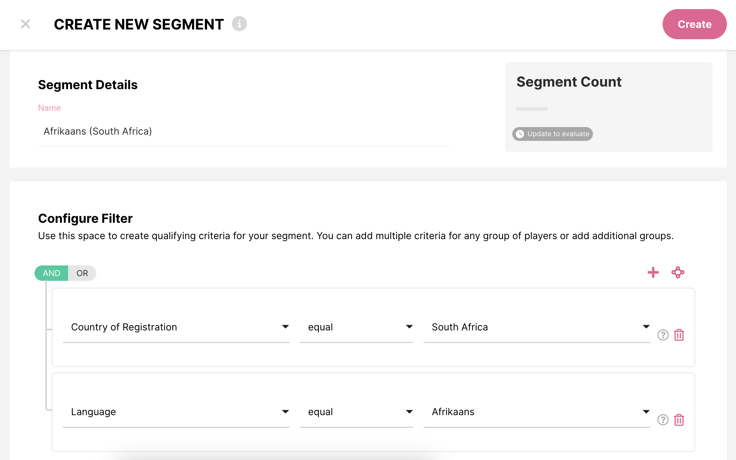 El Segmento en el Perfil de Comunicación decidirá qué jugadores recibirán qué traducciones/contenido específico por mercado en tus Acciones.