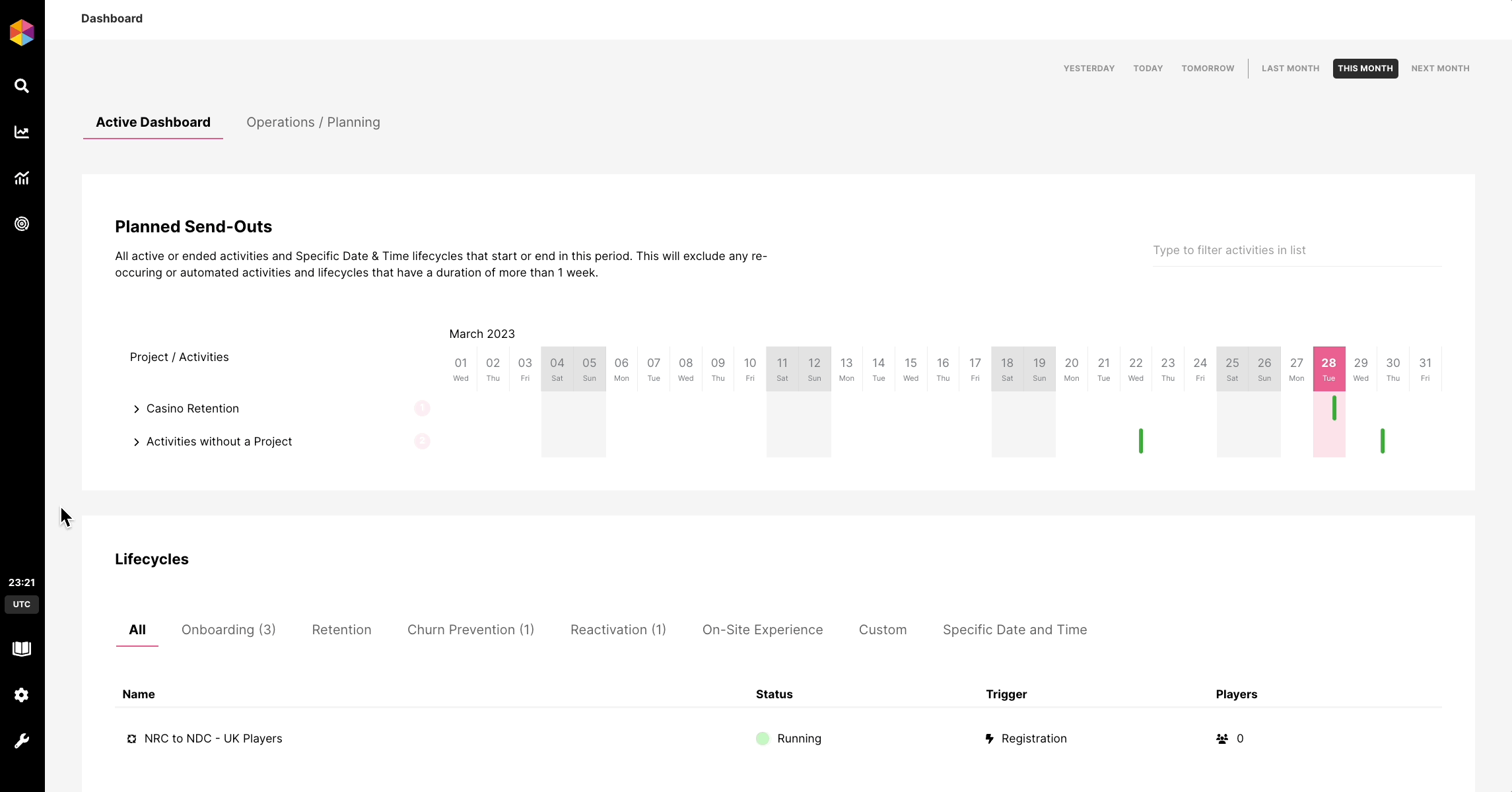Para aclarar, el Segmento en tu Actividad/Lifecycle sigue siendo tu público objetivo pero con la ayuda de los Perfiles de Comunicación añades un filtro adicional. Este filtro asegura que la versión correcta de la Acción, con las traducciones y el contenido específico por mercado, se envíe a los jugadores que cumplan los criterios de cualquier Perfil de Comunicación.