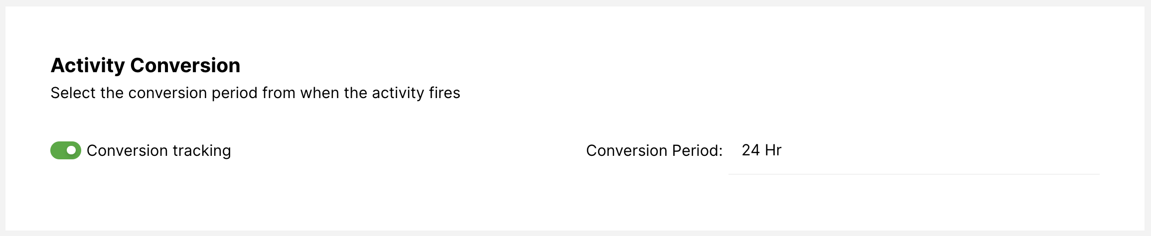 Con la ayuda del seguimiento de conversiones, puedes hacer seguimiento de la tasa de éxito y los números de tus actividades pasadas. Por defecto, una actividad recién creada está configurada para rastrear durante un periodo de conversión de 24 horas.