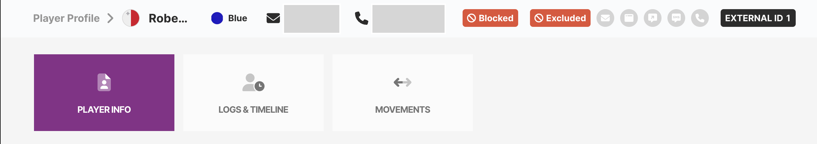Por defecto, los jugadores bloqueados y excluidos son visibles en nuestra plataforma. Estos jugadores se resaltan con etiquetas en la Línea de Tiempo del Jugador, como en la imagen a continuación.