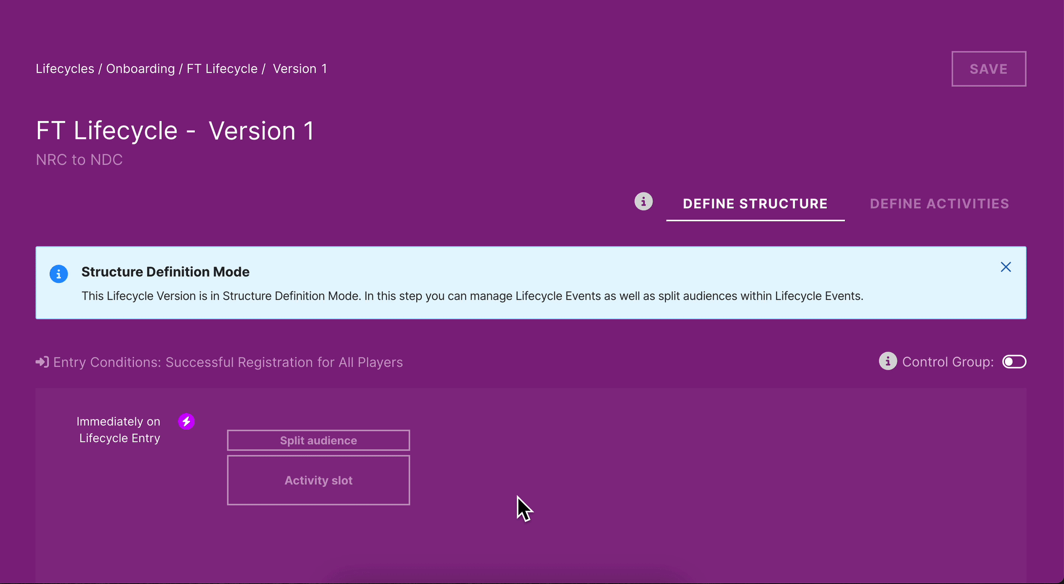 Si no decides dividir la audiencia, significa que todos los jugadores que entren en el Lifecycle recibirán la misma comunicación. No habrá variaciones dentro del Lifecycle.