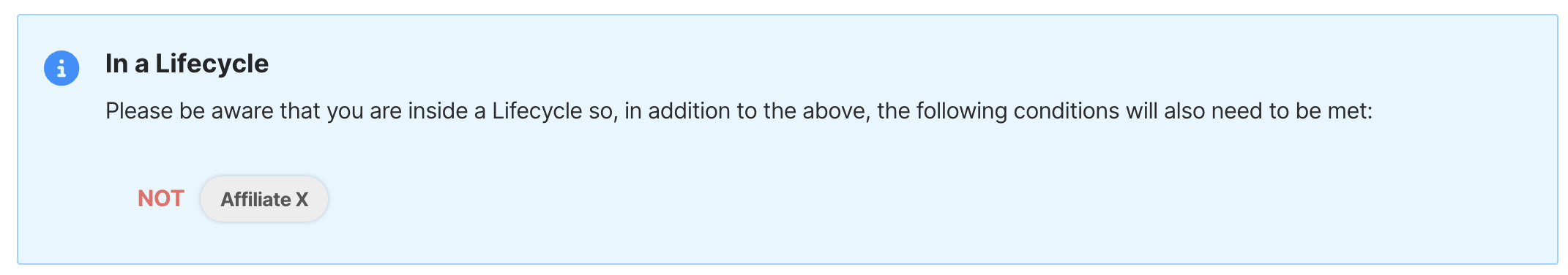- Al añadir una audiencia dividida, verás un recordatorio sobre cualquier condición que afecte al nuevo Segmento desde otros Segmentos dentro del Lifecycle.