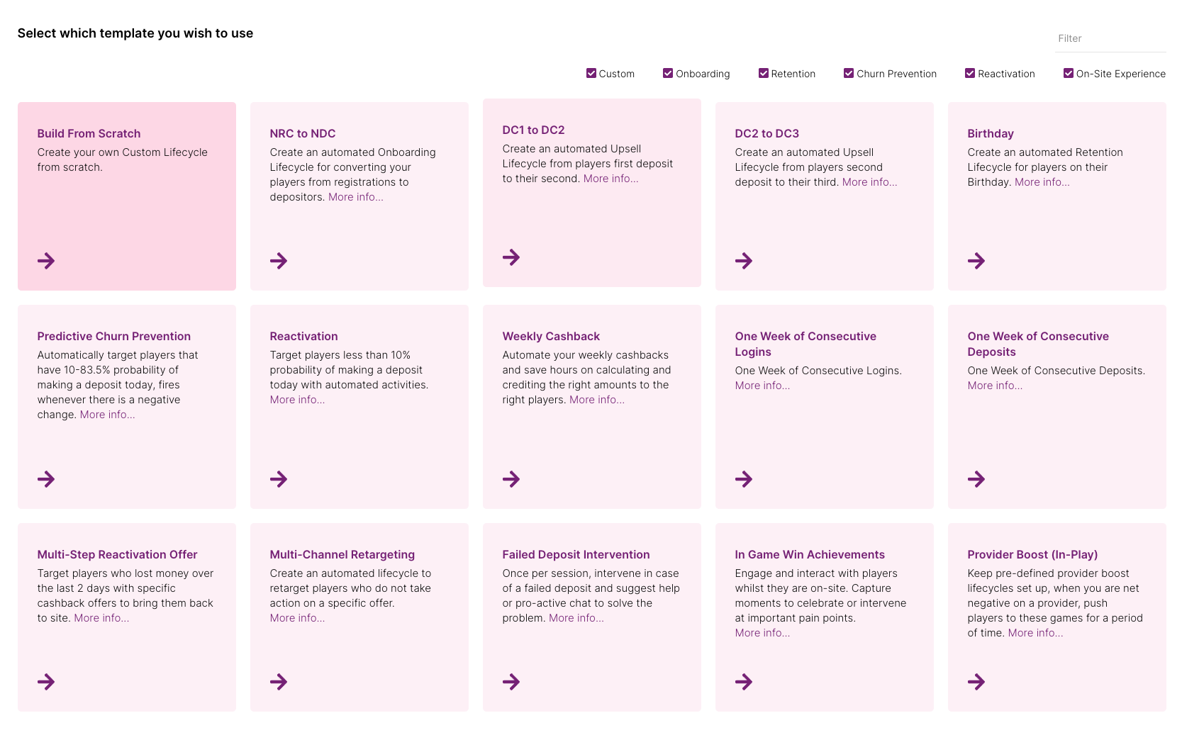 Las plantillas de Ciclo de Vida están ahí para proporcionar inspiración. Creemos que capturan los aspectos más importantes del recorrido del jugador. Si no sabes por dónde empezar, echa un vistazo a las plantillas disponibles e intégralas en tu actividad de CRM.