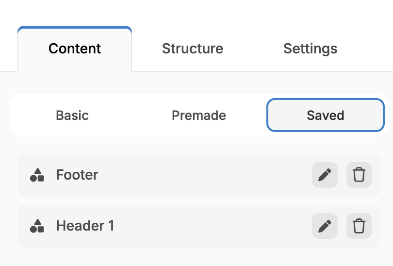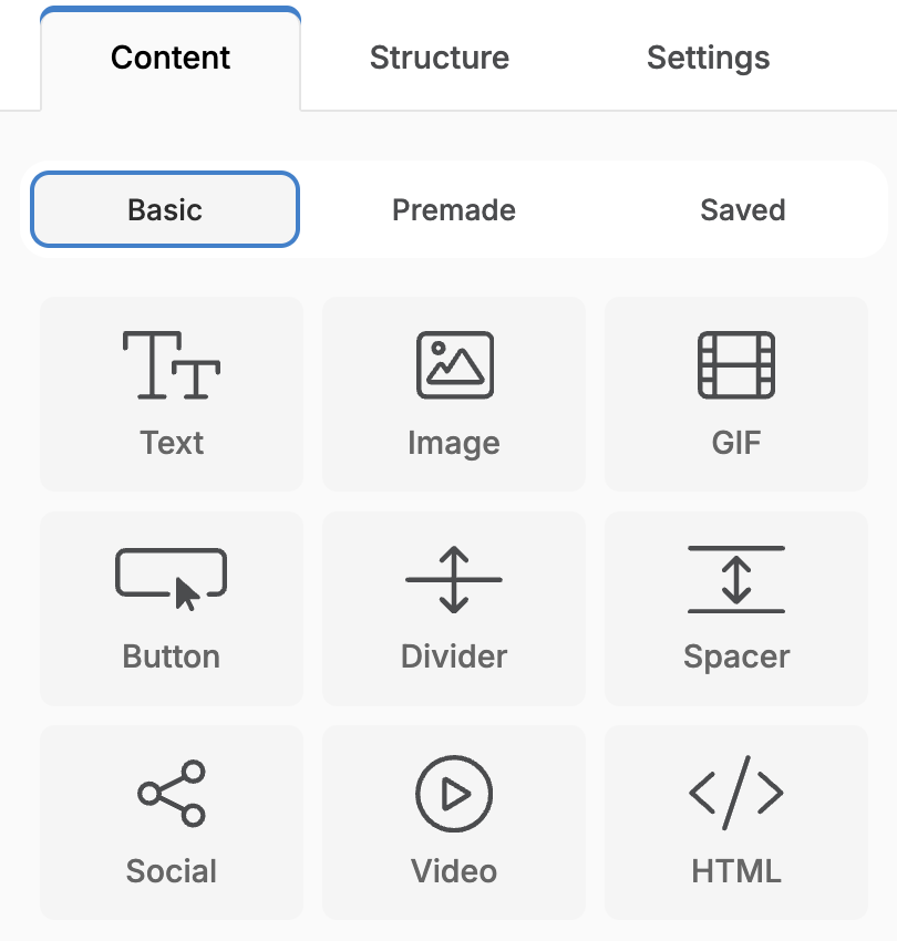 La sección de Contenido ofrece una variedad de bloques constructores que puedes usar en tu plantilla. Dentro de esta sección encontrarás tres pestañas: Básico, Prediseñado y Guardado, permitiéndote elegir entre elementos individuales simples o bloques de contenido listos para usar para agilizar tu proceso de diseño.