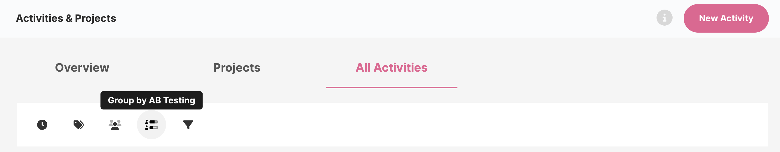 Agrupar Actividades por prueba AB te permite filtrar todas las Actividades que tengan más de un Grupo de Acción creado. Si una Activity tiene múltiples Grupos de Acción dentro, aparecerá en la lista de abajo al seleccionar esta opción.