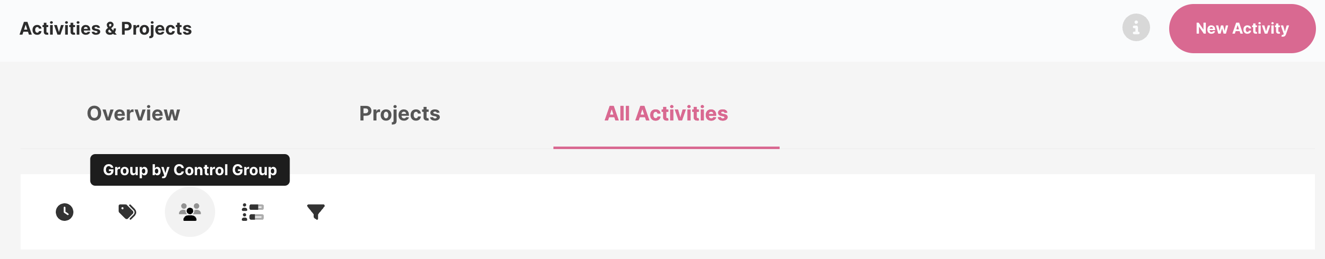 Agrupar Actividades por Grupo de Control te permite filtrar todas las Actividades que tengan un Grupo de Control habilitado. Si una Activity tiene aplicado un Grupo de Control, aparecerá en la lista de abajo al seleccionar esta opción.
