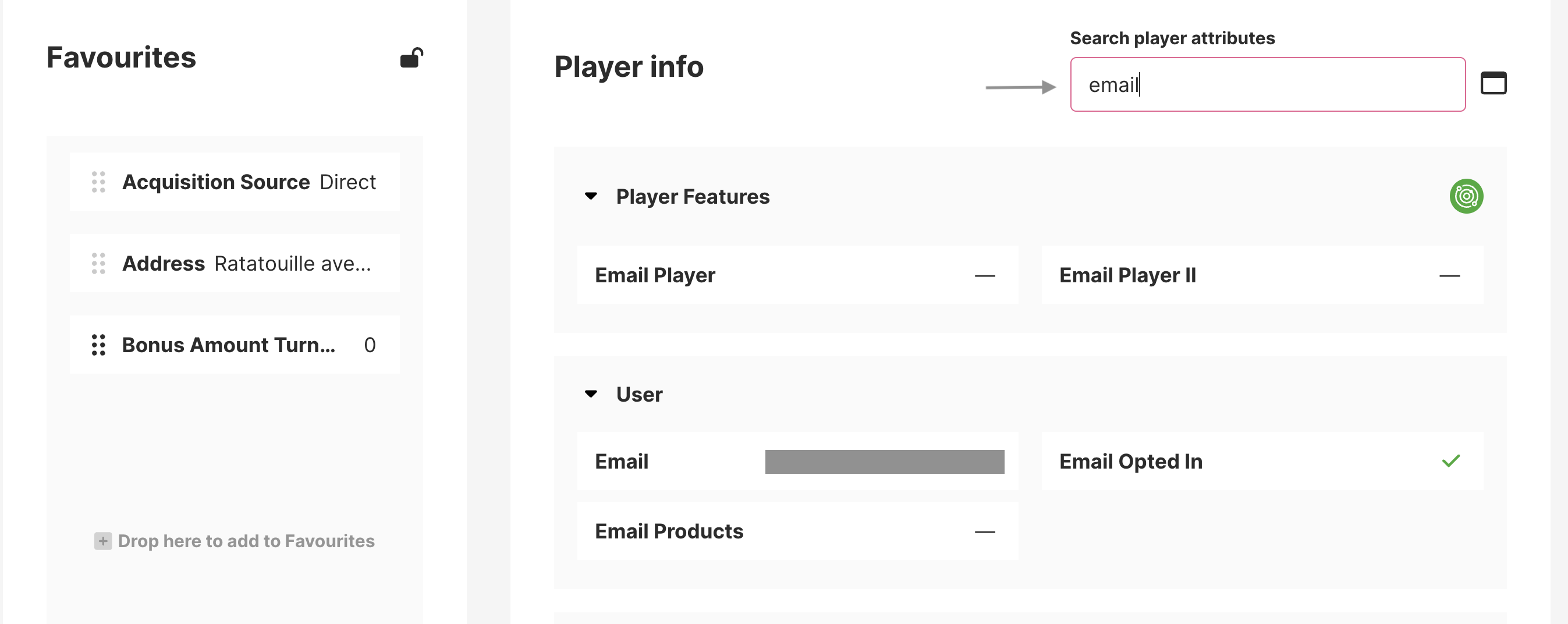 Dependiendo de la configuración de tu integración, también puedes ver categorías como Funcionalidades del Jugador, Deportes, Tags y más. Cada categoría puede expandirse para revelar múltiples atributos recopilados en todo tu ecosistema.