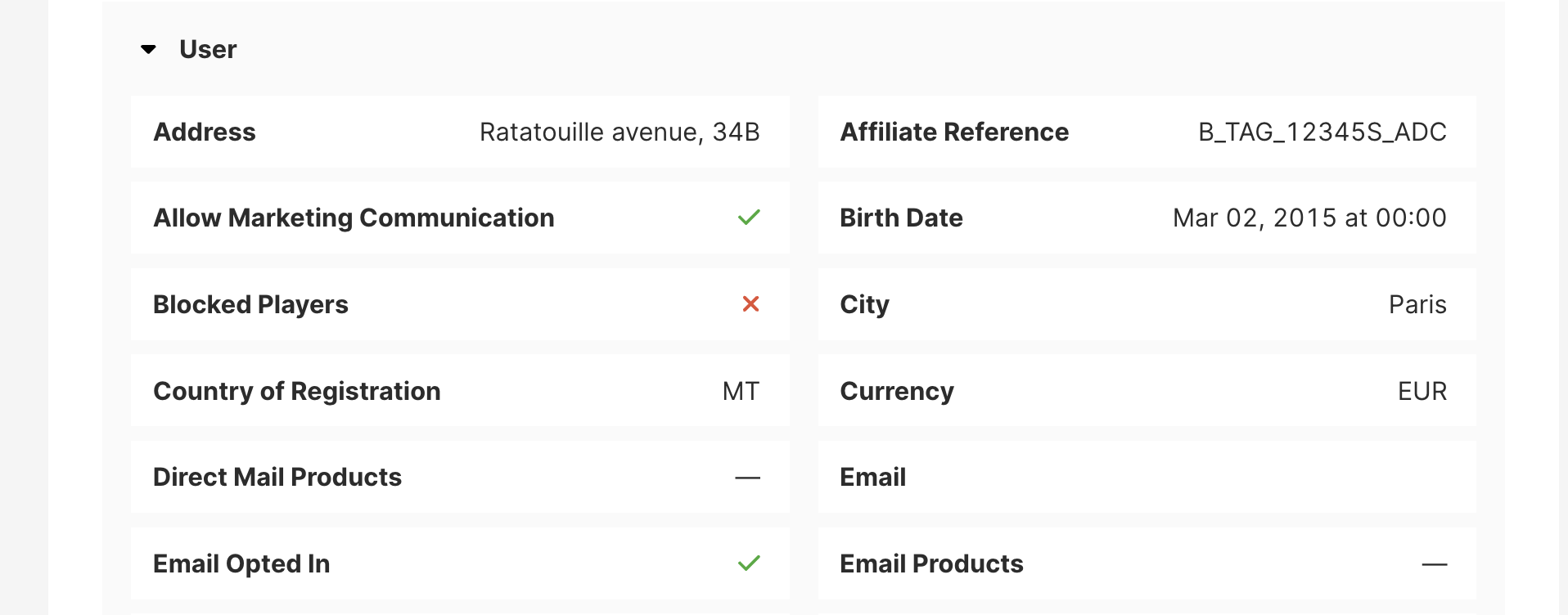 Esta sección dentro de los perfiles de jugador es ideal para comprobaciones rápidas al verificar la identidad, entender la configuración del jugador o asistir en casos de soporte al cliente. Muestra toda la información relacionada con el jugador, organizada en secciones expandibles. Estas están divididas en múltiples categorías como: