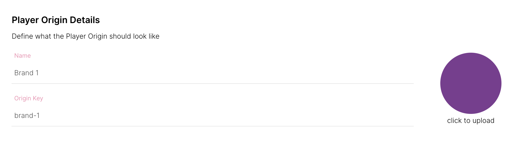 Una vez que hayas creado un nuevo Origen de Jugador, a continuación debes darle un nombre, clave de origen, y un icono/logotipo. Estos detalles serán visibles en FT CRM para indicar cuándo el origen está en uso dentro de Actividades y Lifecycles.