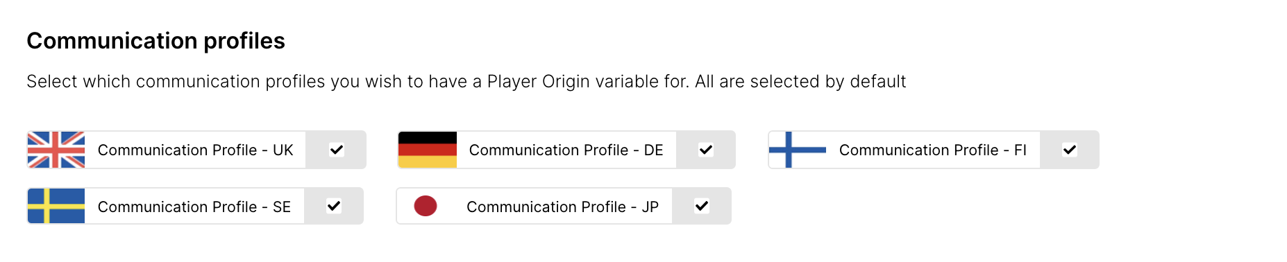 Aquí tienes la posibilidad de agregar configuraciones únicas para uno o varios Perfiles de Comunicación. Solo es necesario seleccionar Perfiles de Comunicación SI buscas agregar información y configuraciones únicas basadas en el Perfil de Comunicación. Por ejemplo, para usar Traducciones para tus Acciones, los Perfiles de Comunicación deben agregarse a tus Orígenes.