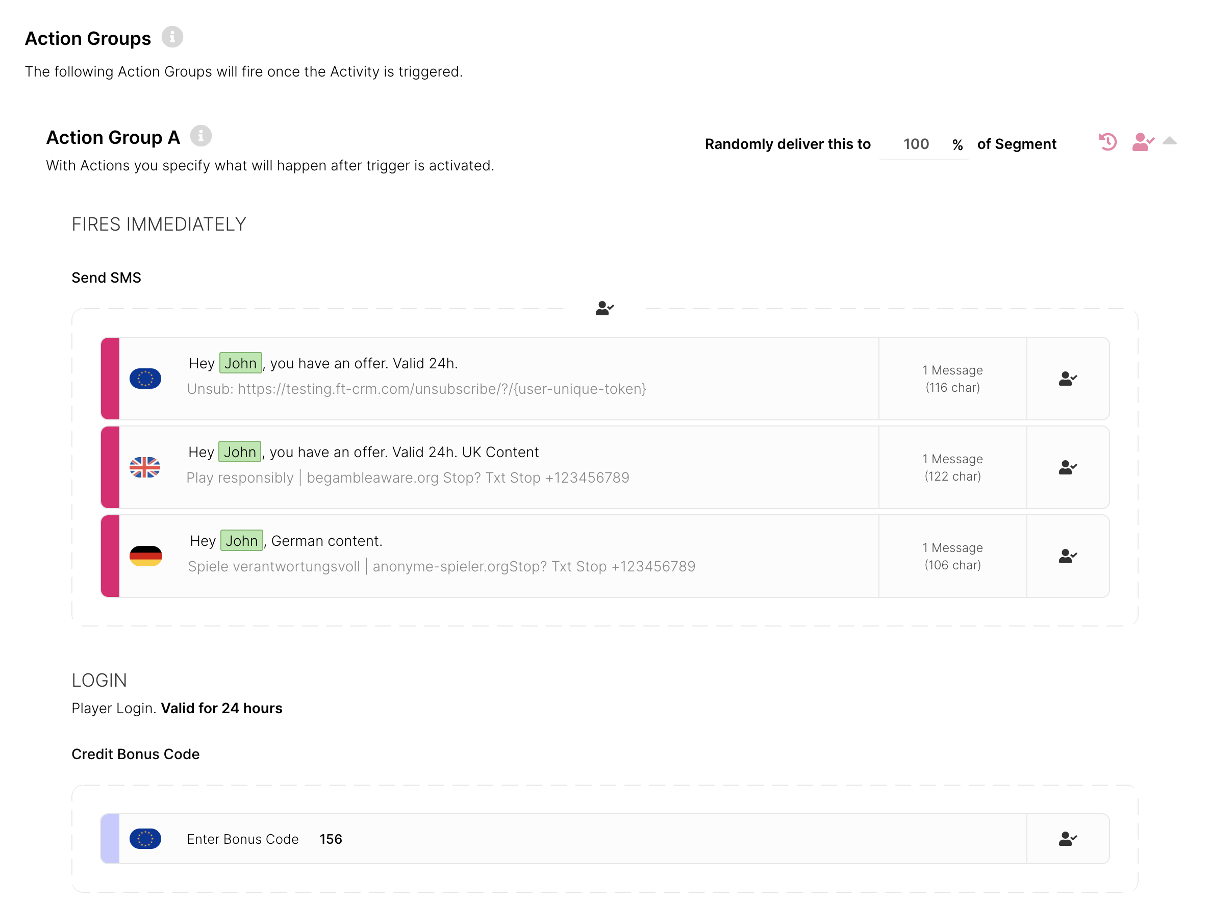 Nota: Su(s) Usuario(s) de Prueba recibirá(n) todas las Acciones de prueba seleccionadas independientemente del estado de opt-in, bloqueos y consentimientos.