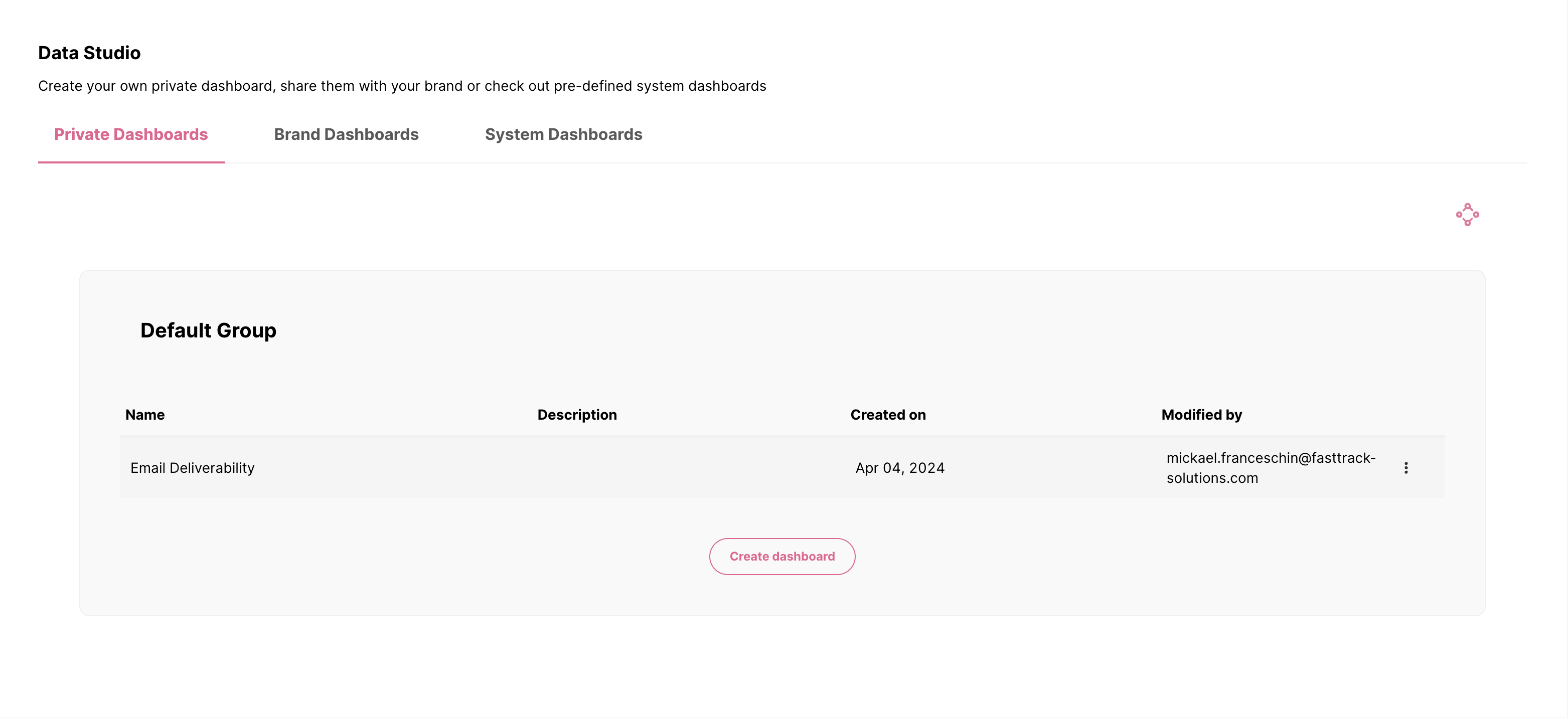 - Paneles de Marca: Los Dashboards de Marca serán visibles para ti y cualquier usuario que tenga acceso a tu entorno FT CRM y acceso al Data Studio.