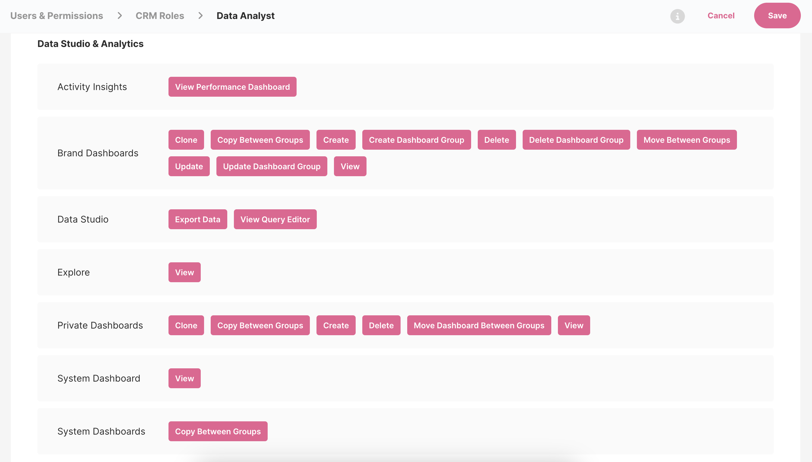 Para obtener acceso a los Dashboards necesitas tener acceso al Data Studio. Puedes conseguirlo fácilmente teniendo el rol 'Analista de Datos' asignado a tu Usuario, o teniendo el Data Studio & Analytics permisos habilitados para ti.
