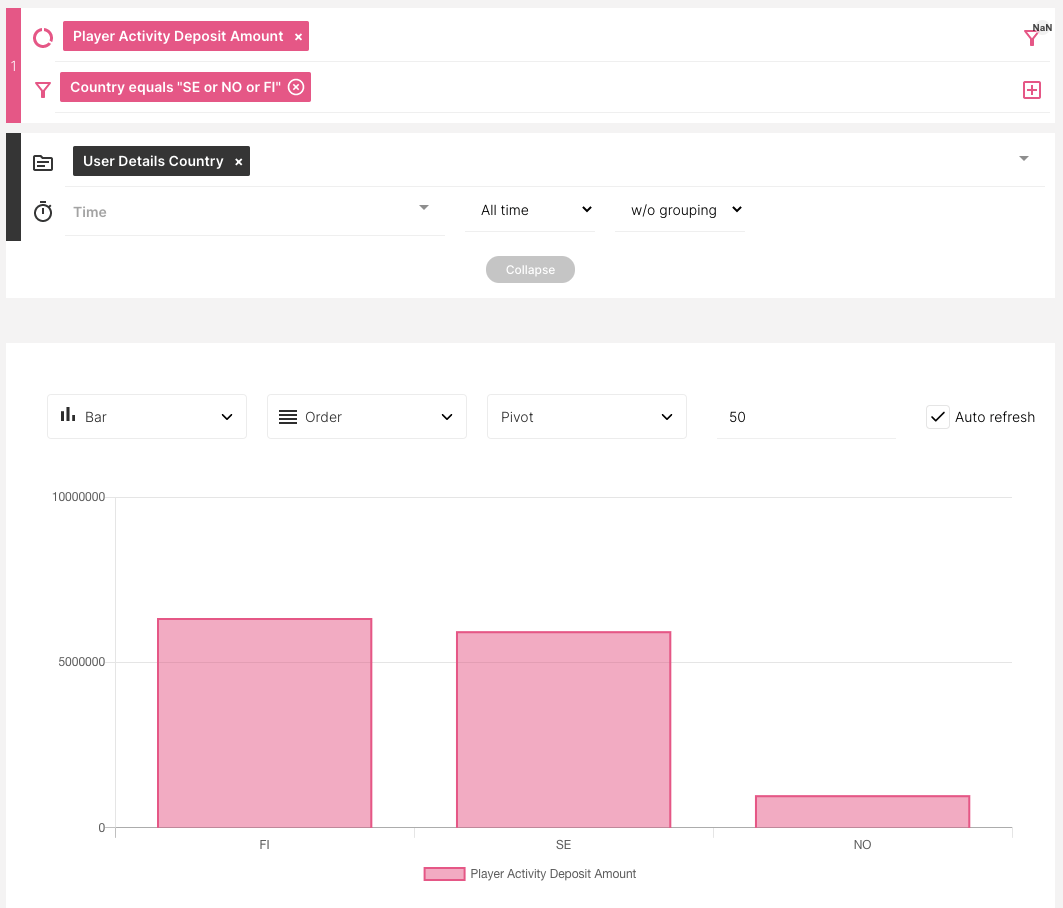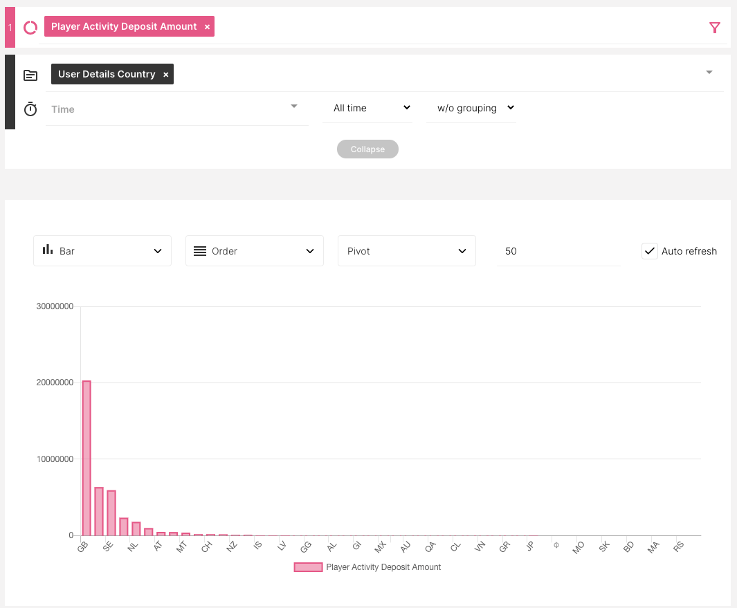 En el gráfico de barras anterior, podemos ver la Medida [Deposit Amount] representada por las barras rosadas. La altura de las barras corresponde a los números/valores en el eje y. La Dimensión [Country] está representada en el eje x.