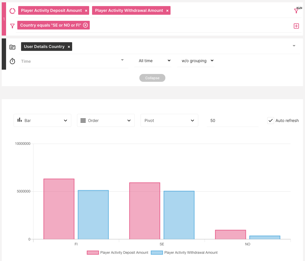 En el gráfico anterior, ahora podemos ver 2 barras por cada país. La barra rosada representa [Deposit Amount] y la barra azul [Withdrawal Amount].