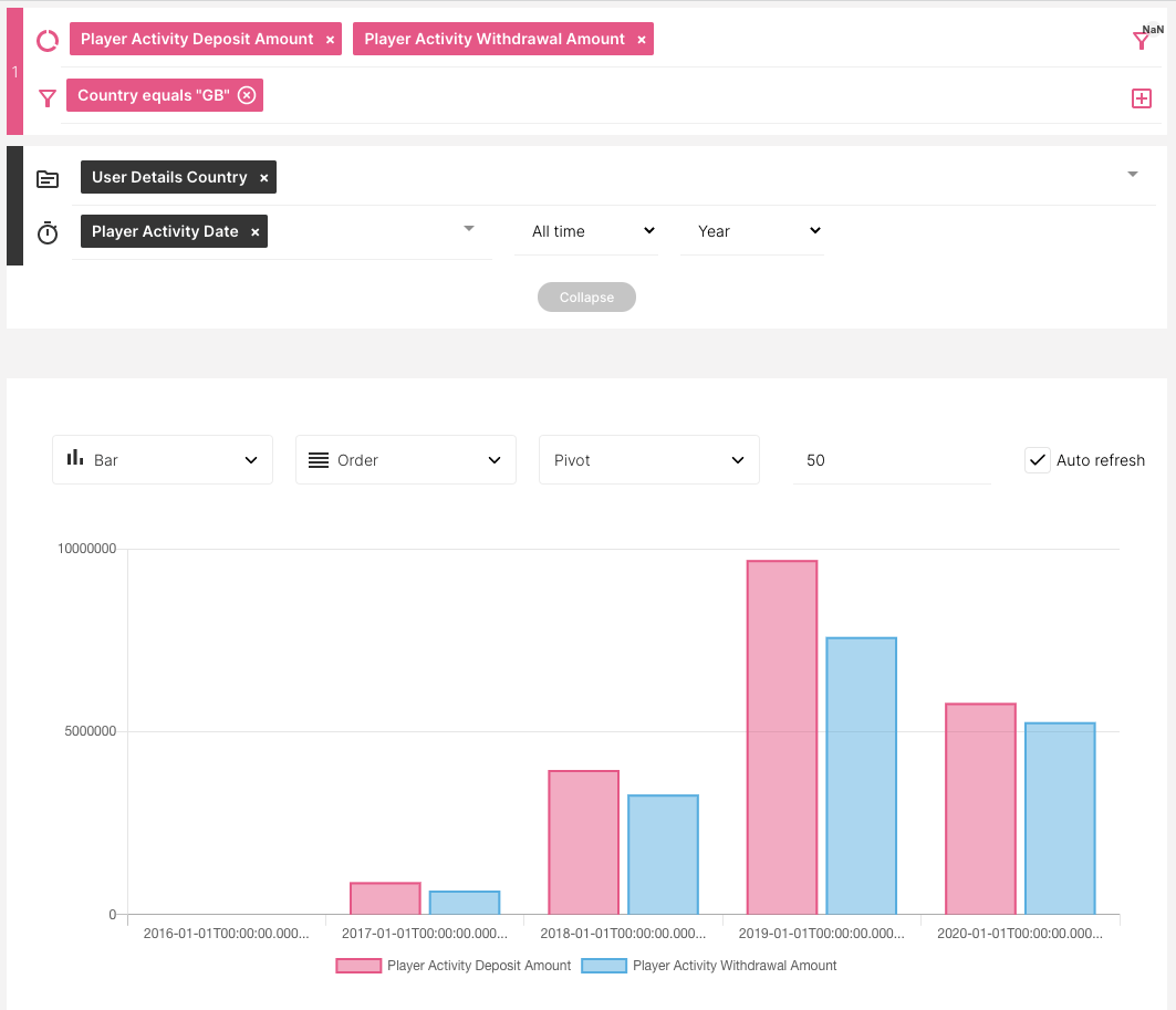 En el gráfico de barras anterior, ahora nos centramos únicamente en el mercado GB (Reino Unido). Podemos ver la comparación entre la cantidad total de depósitos y la cantidad total de retiros para cada año: 2016, 2017, 2018, 2019 y 2020.