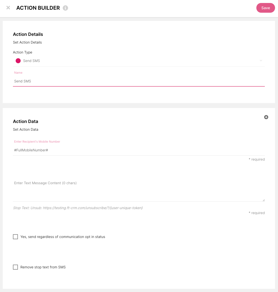 Para configurar el SMS simplemente elegimos el tipo de acción "Enviar SMS" y una vez más llenamos los campos requeridos que aparecen abajo.