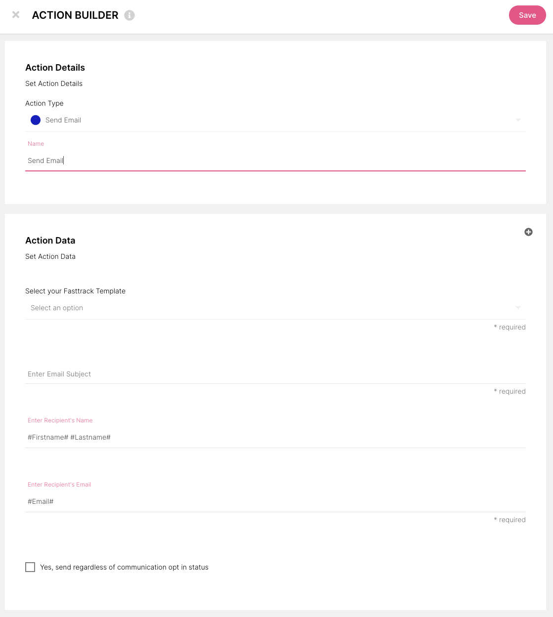 Elegimos el tipo de acción "Enviar Correo Electrónico", seleccionamos una plantilla, y luego llenamos los campos requeridos que aparecen abajo para crear el correo electrónico.