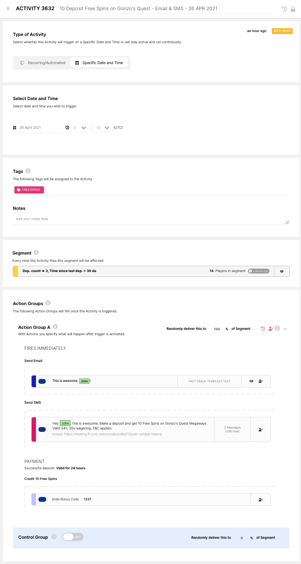 Una actividad puede configurarse para ser cualquier cosa desde un simple envío de correo electrónico hasta una campaña más avanzada con múltiples canales de comunicación y acciones de seguimiento. Esta es una actividad que se activará en una fecha y hora específica y ocurrirá solo una vez.