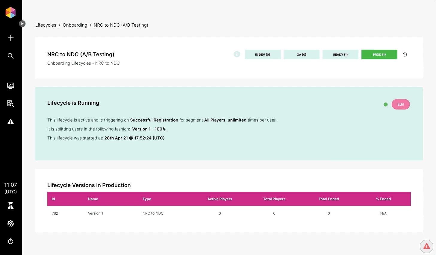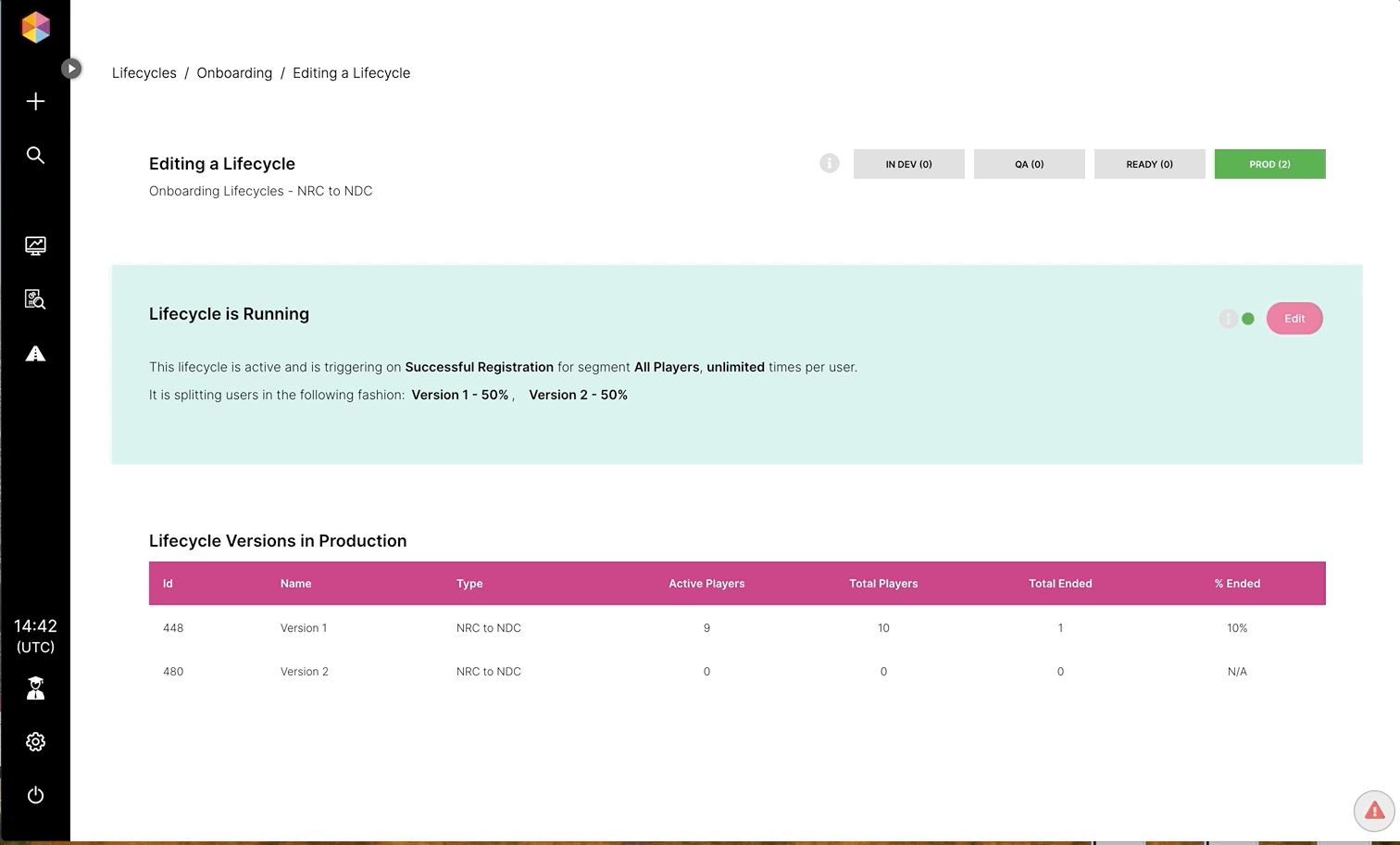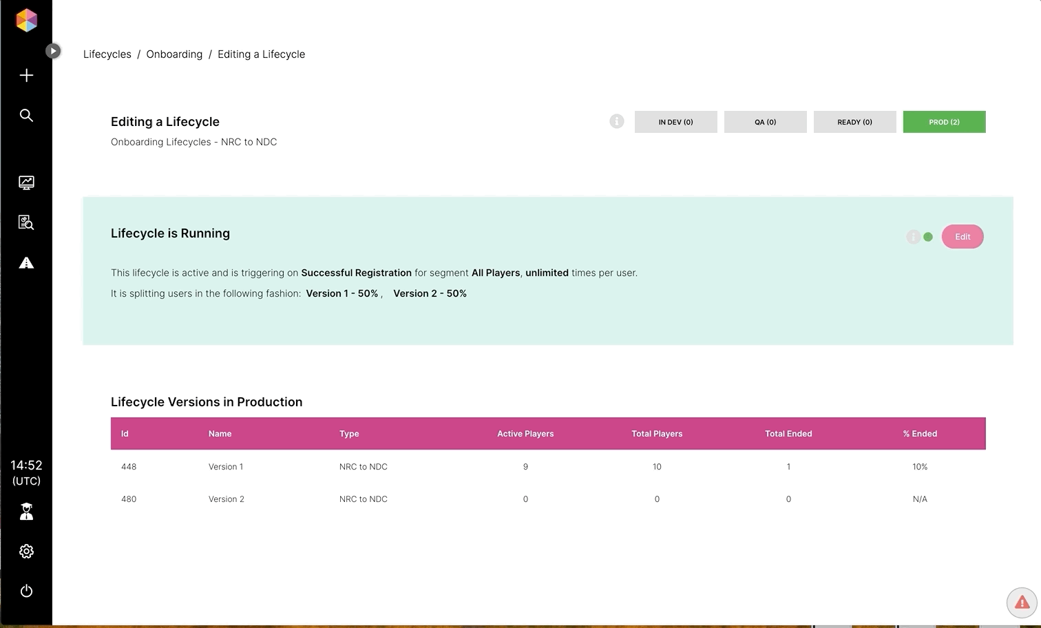 Ejemplo: La Versión 1 de nuestro lifecycle está activa y en producción. Hemos creado una segunda versión con un engagement de jugador alternativo.