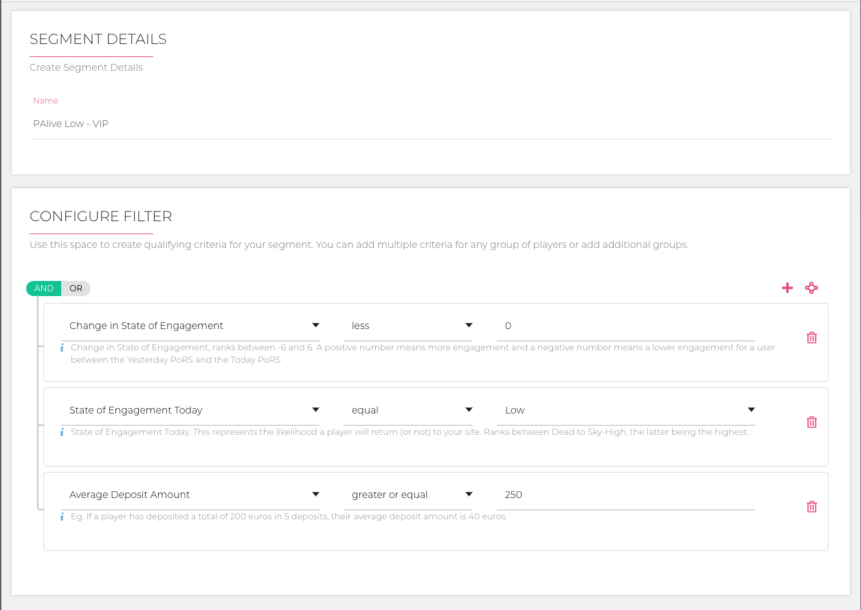 Hemos agregado un ejemplo simple de configuraci贸n para un segmento de prevenci贸n de abandono a continuaci贸n. Se dirigir谩 a un jugador de Alto Valor que cae al segmento Bajo. Ten铆an una mayor probabilidad de regresar ayer de la que tienen hoy.