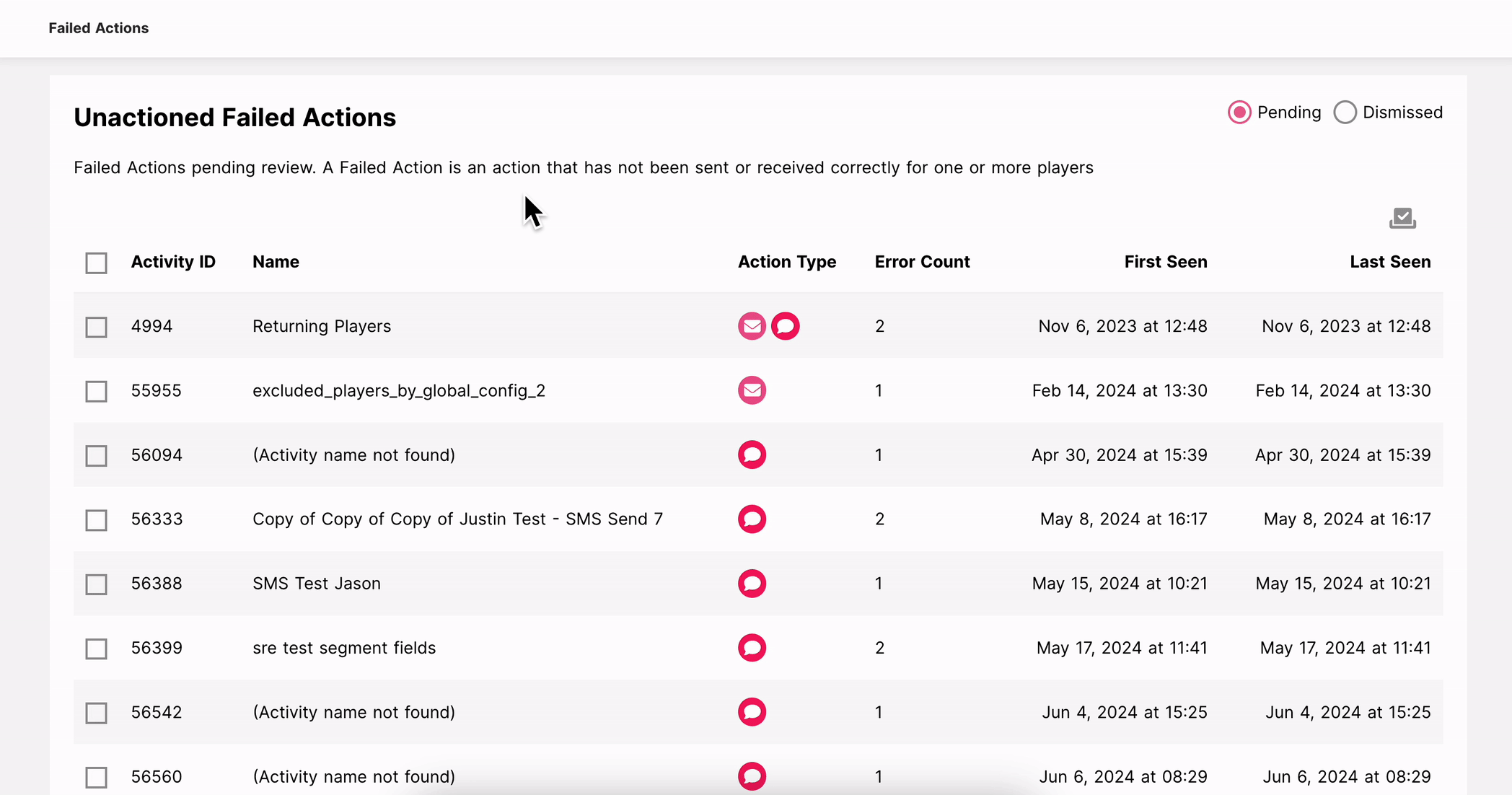Na página inicial de Ações Falhadas (a secção 'Pendente'), poderá rever quaisquer Atividades com Ações Falhadas.
