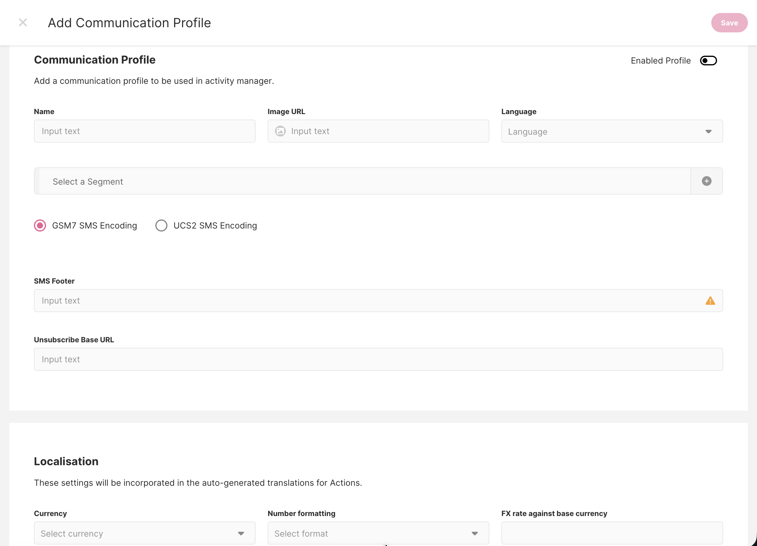 Com a ajuda dos Perfis de Comunicação, tem a flexibilidade de enviar conteúdo e ofertas específicos por mercado dentro da mesma Actividade. Esta também é a forma de adicionar traduções.