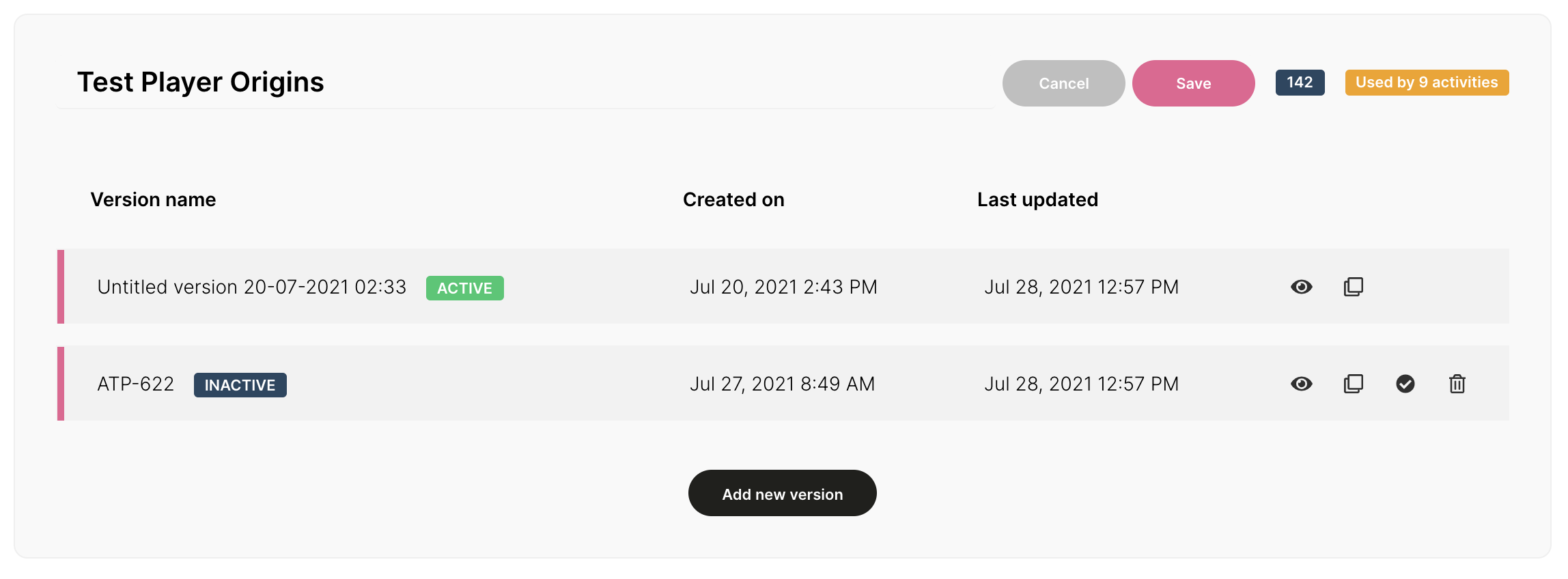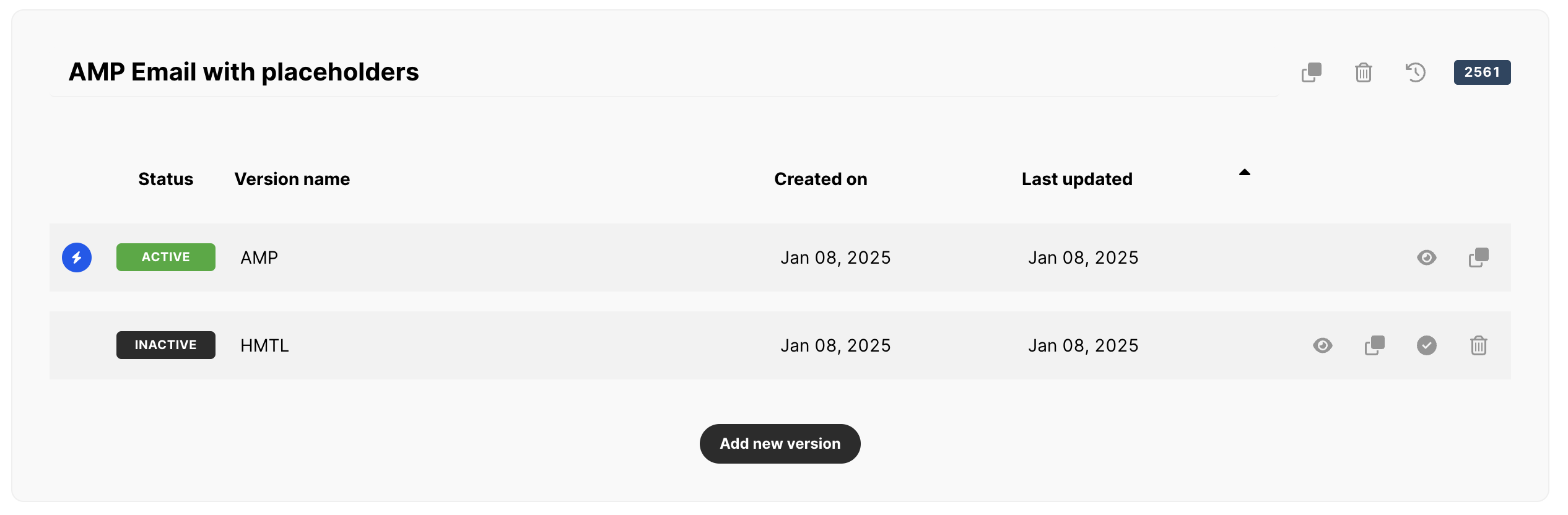 Você pode adicionar quantas versões quiser dentro do seu modelo, no entanto, apenas uma versão pode estar ativa por vez. Com um único clique, você pode tornar outra versão ativa:
