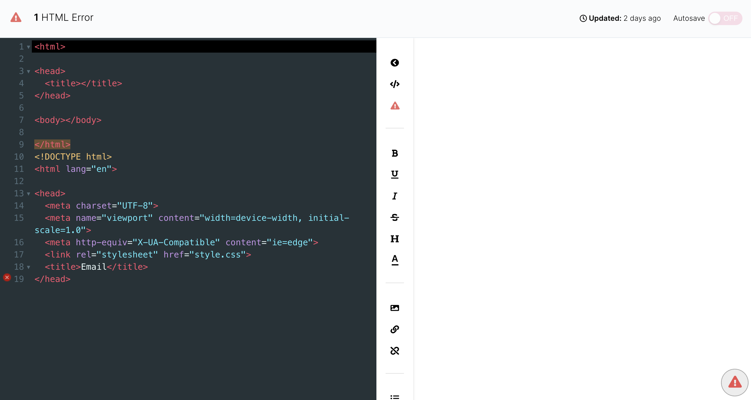 Quaisquer erros no seu HTML serão exibidos na barra superior dentro do Modelo de Email. Você também pode encontrar um 'X' vermelho dentro do editor de código ao lado da linha que contém o erro.