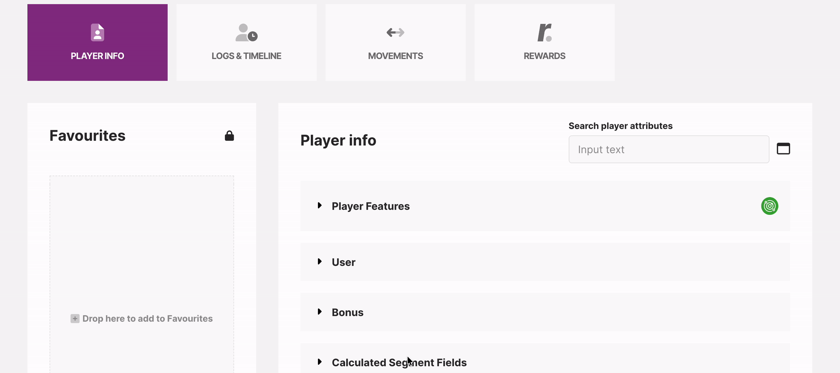 Esta seção dentro dos perfis de jogador é ideal para verificações rápidas ao confirmar identidade, entender a configuração do jogador ou auxiliar casos de suporte ao cliente. Exibe todas as informações relacionadas ao jogador, organizadas em seções expansíveis. Estas são divididas em várias categorias, tais como:
