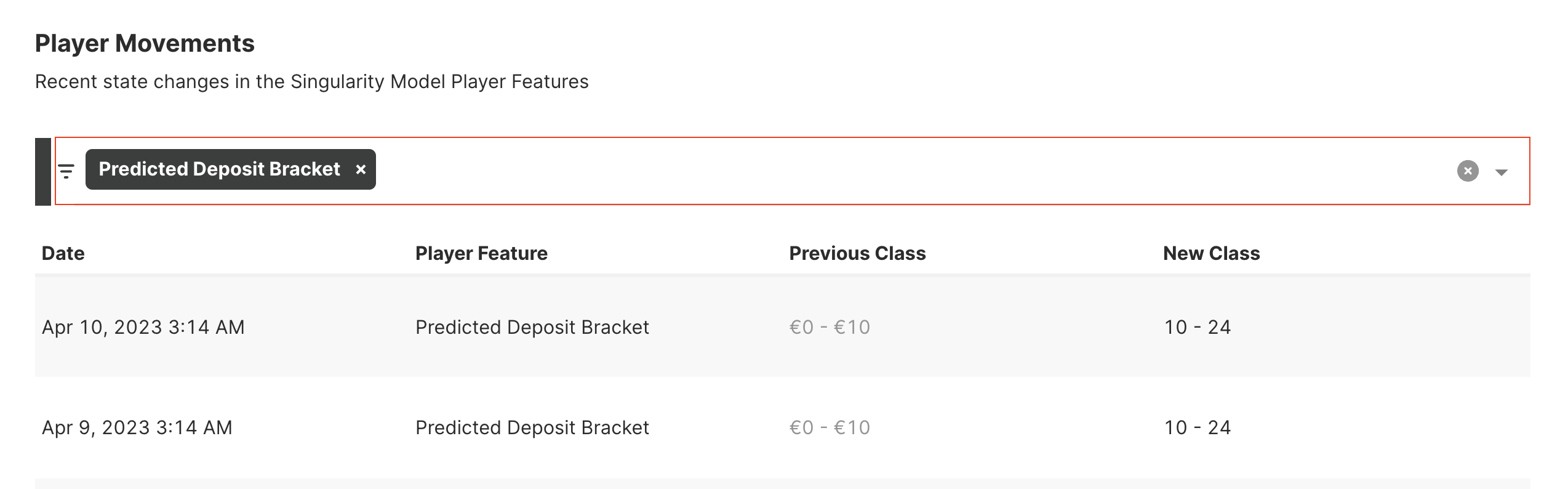 A seção Movimentos dentro de um Perfil de Jogador permite acompanhar e revisar mudanças recentes nas Características de Jogador do Modelo Singularity. Ela mostra como as Características de Jogador evoluem, destacando quando um jogador passa de uma classe ou valor para outro.