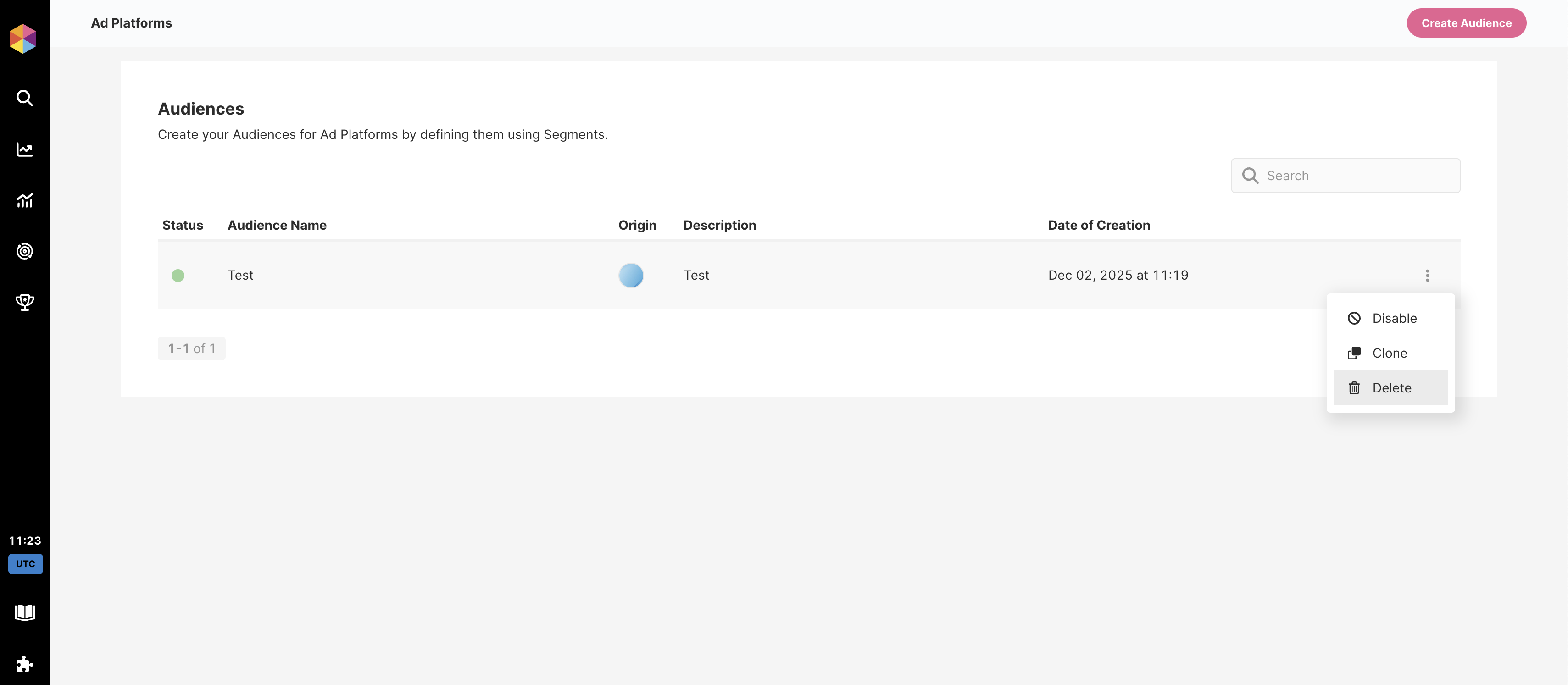 Uma vez que uma audiência tenha sido criada, ela aparecerá na lista de audiências na página Ad Platforms página. Neste ponto, a audiência existe apenas dentro do Fast Track—ela ainda não foi criada na plataforma de terceiros.