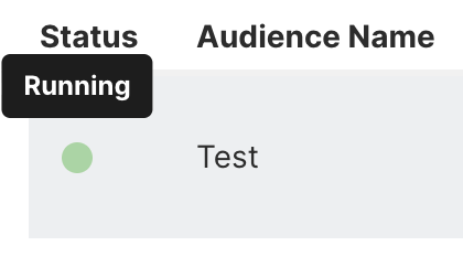 - 🟢⚪ Em Execução — A Audiência foi ativou e criada no Meta. Está sendo ativamente sincronizada diariamente às 18:00 UTC. O ícone de status pode aparecer pulsando ou piscando verde e branco para indicar visualmente que a audiência está ativa.