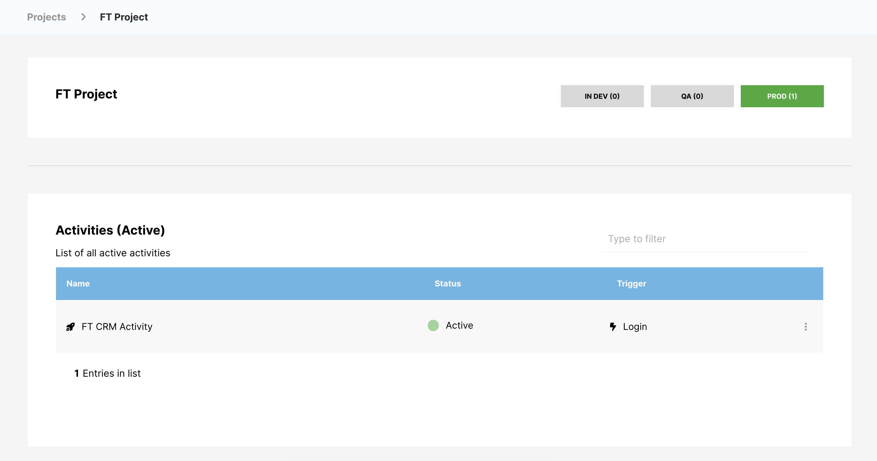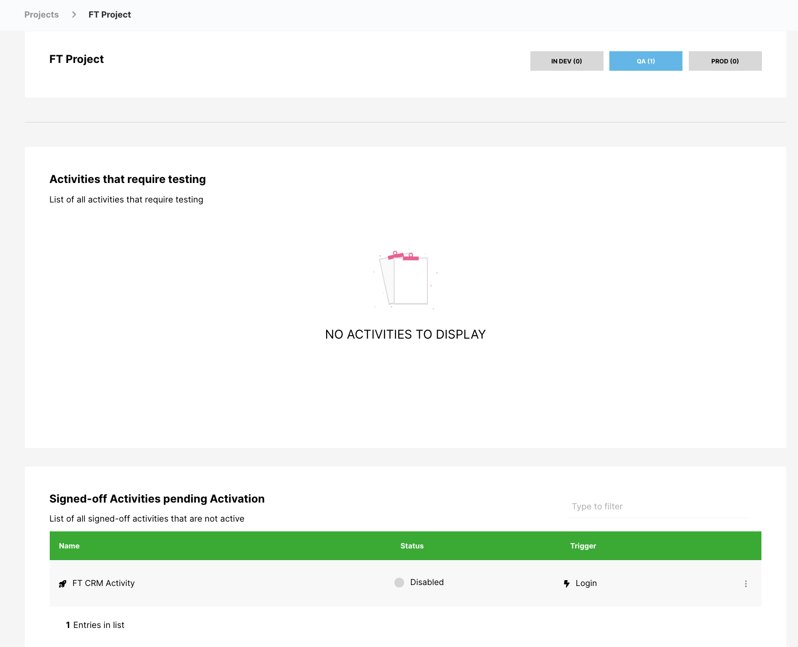 Quaisquer Atividades desativadas e com QA permanecerão na fase de QA até serem ativadas. Uma vez ativada, ela passará para a fase PROD.