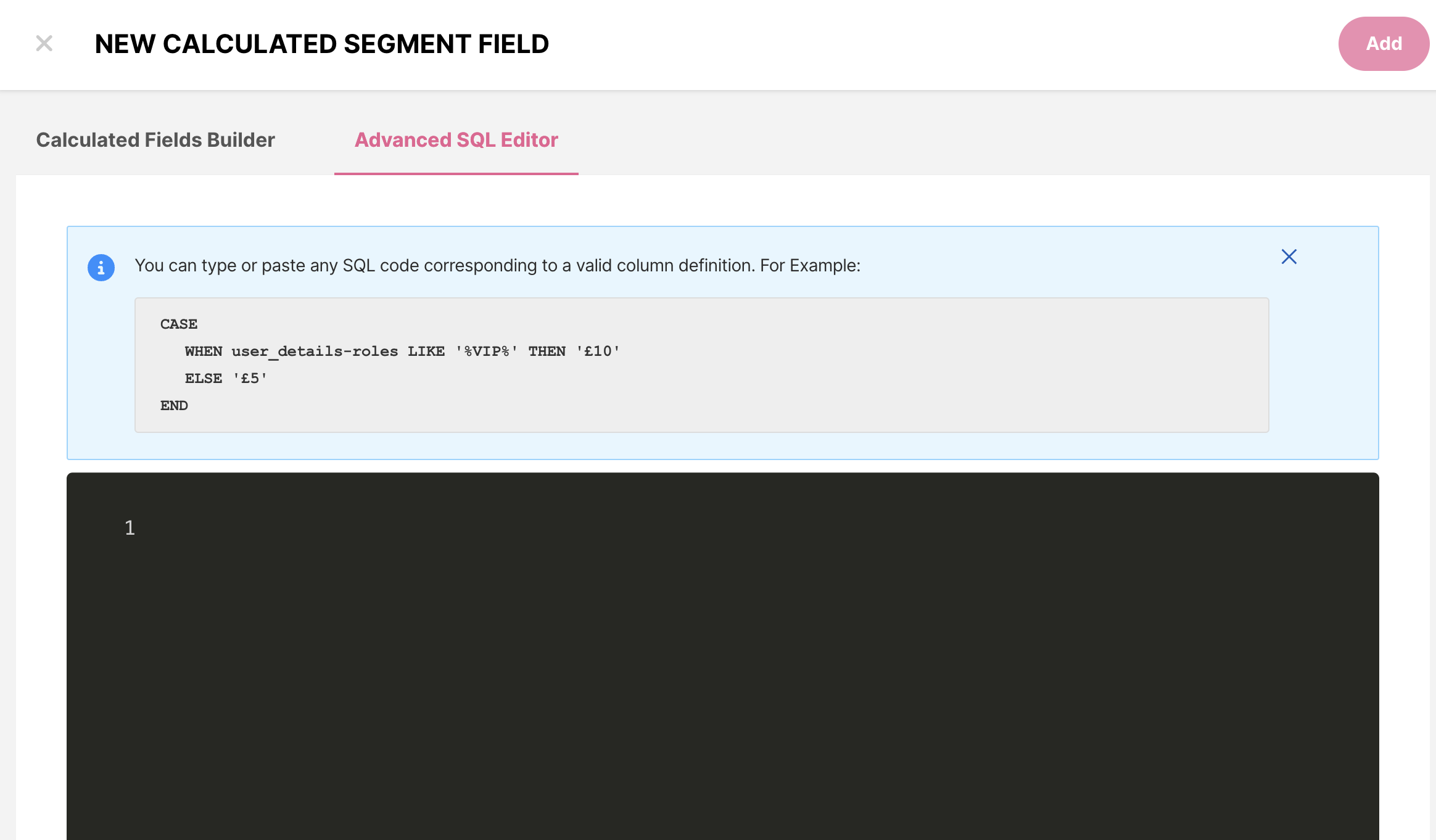 Aqui você pode inserir suas próprias consultas SQL para criar novos Campos de Segmento Calculados.